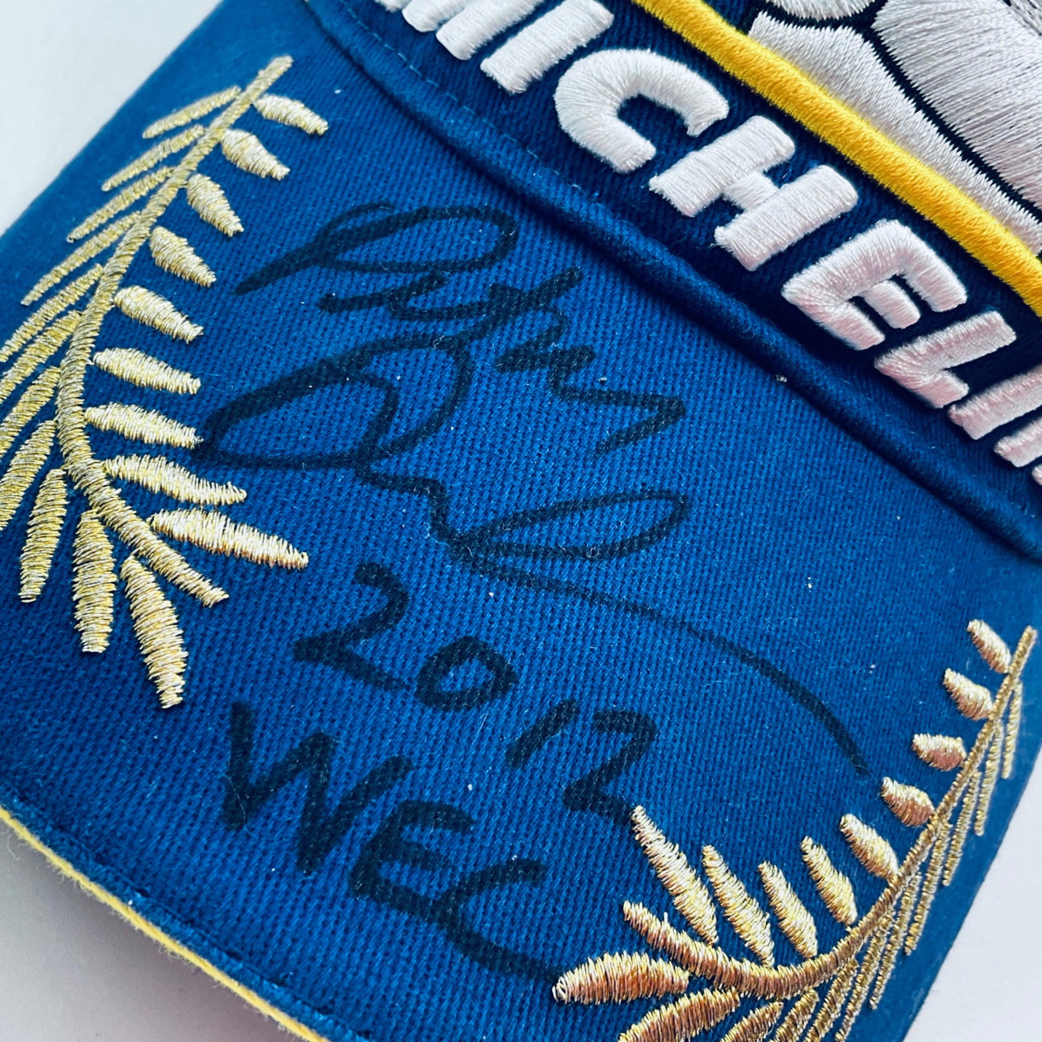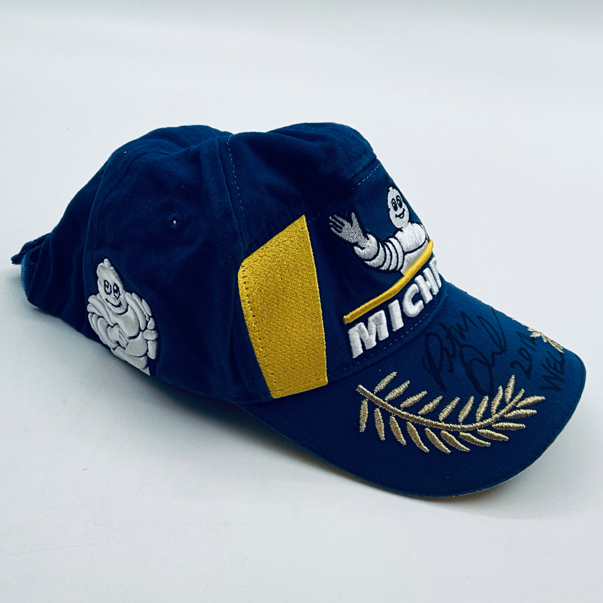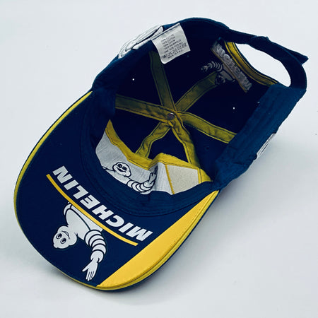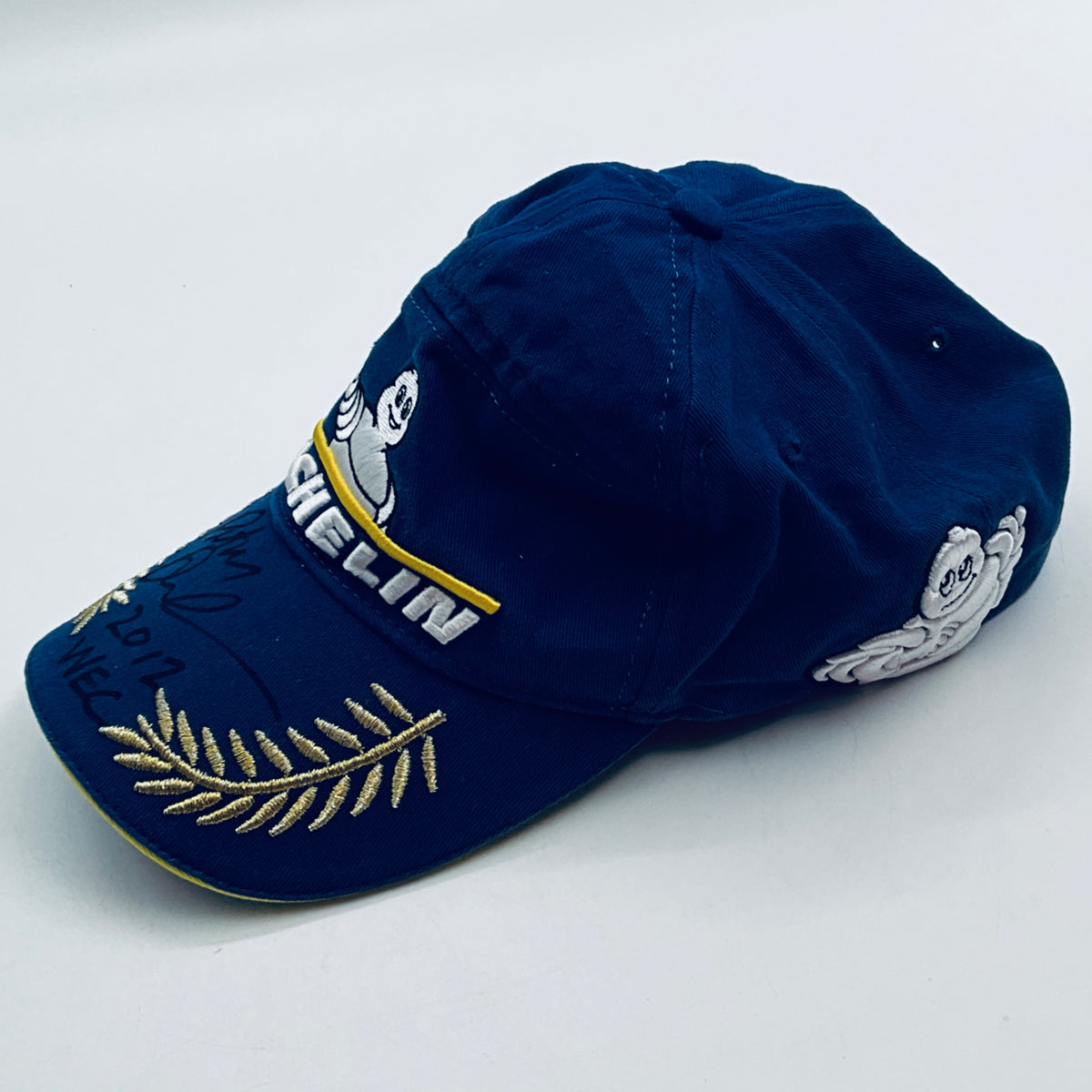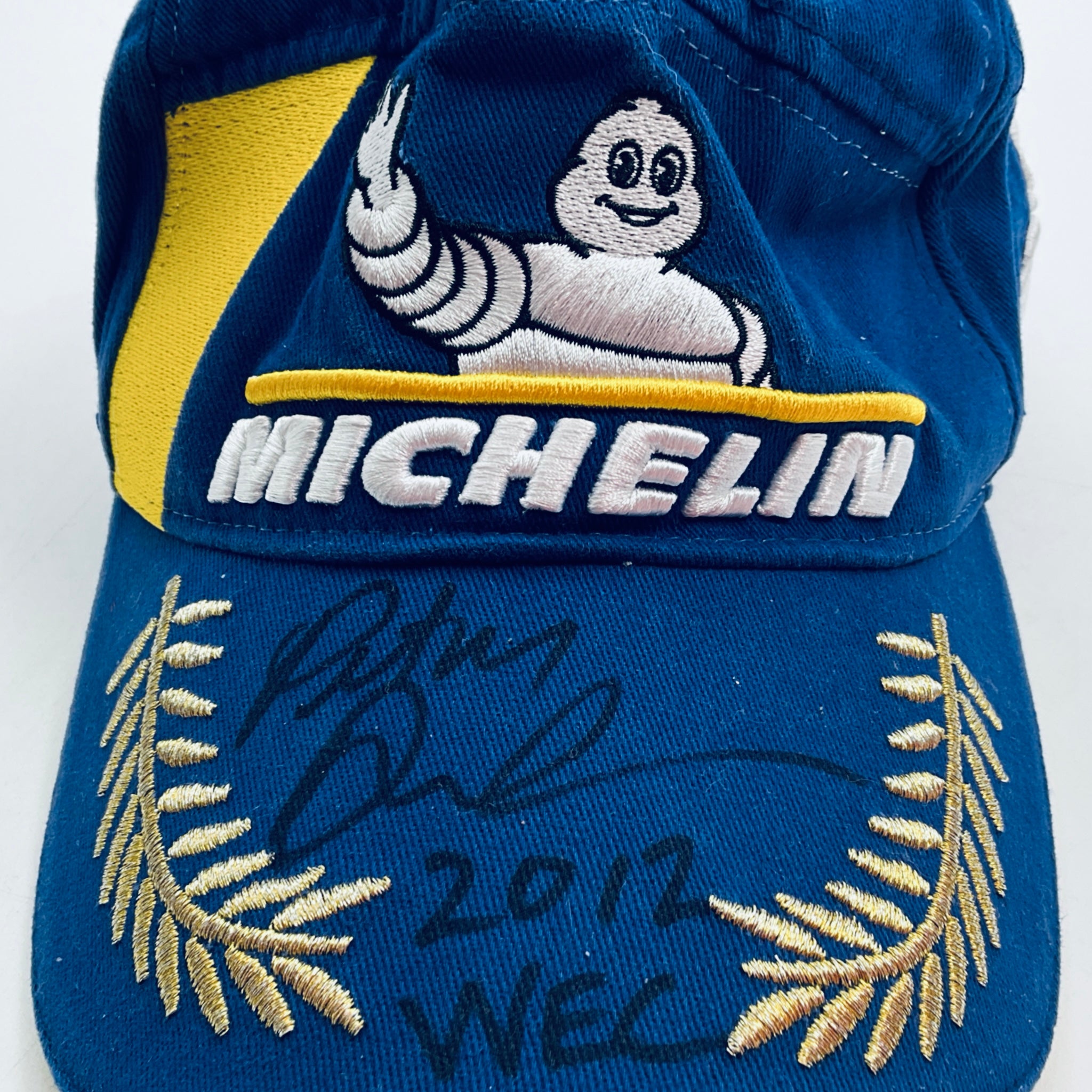 Own a piece of motorsport history with this authentic 2012 Michelin Tyres drivers podium cap worn by Peter Dumbreck during his distinguished endurance racing career with Aston Martin Gulf Racing The cap features a hand-signed autograph by Peter Dumbreck in black pen across the peak—a bold, clearly positioned signature that captures the driver's personal touch.