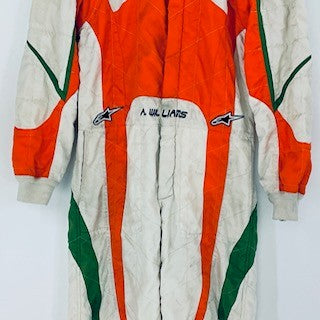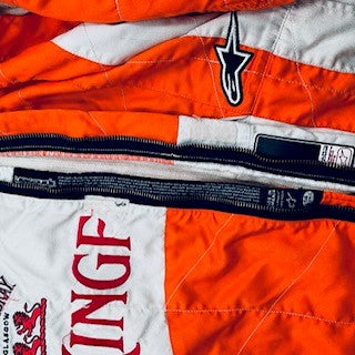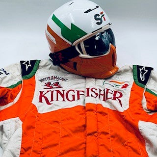 This genuine Alpinestars Nomex pit crew suit comes straight from the high-speed action of the Sahara Force India F1 Team. Showcasing the team's unique and iconic orange, green, and white colours, it proudly displays embroidered team and sponsor logos. A rare find, this suit is the perfect standout piece for any F1 memorabilia collection, office, or motorsport fan’s personal space.