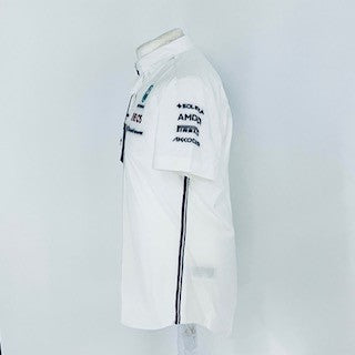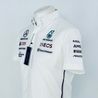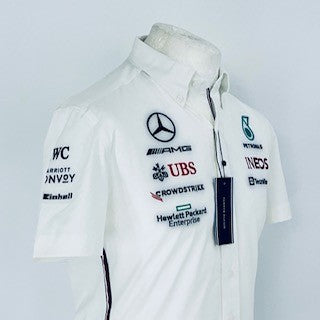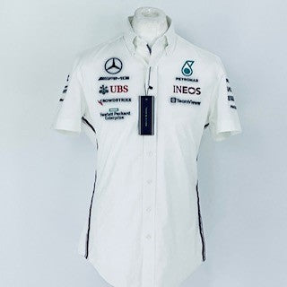 This authentic Mercedes AMG Petronas Formula One Team Issue Tommy Hilfiger Managers Shirt was designed by Tommy Hilfiger specifically for team members and was never released to the public. Made from high-quality materials, this short sleeve cotton shirt showcases embroidered Mercedes AMG F1Team and sponsors logos and boasts button collar, full button front and a breast pocket for storing important possessions. As a rare and desirable item, it is a must-have for any Mercedes or F1 fan.