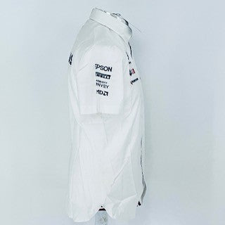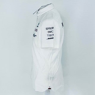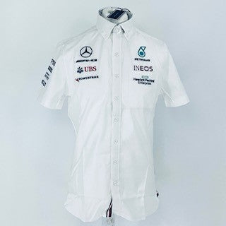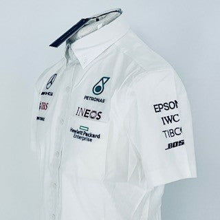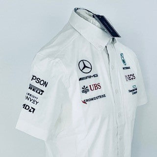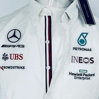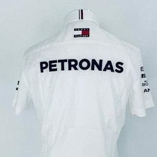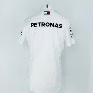 This authentic Mercedes AMG Petronas Formula One Team Issue Tommy Hilfiger Managers Shirt was designed by Tommy Hilfiger specifically for team members and was never released to the public. Made from high-quality materials, this short sleeve cotton shirt showcases embroidered Mercedes AMG F1Team and sponsors logos and boasts button collar, full button front and a breast pocket for storing important possessions. As a rare and desirable item, it is a must-have for any Mercedes or F1 fan.