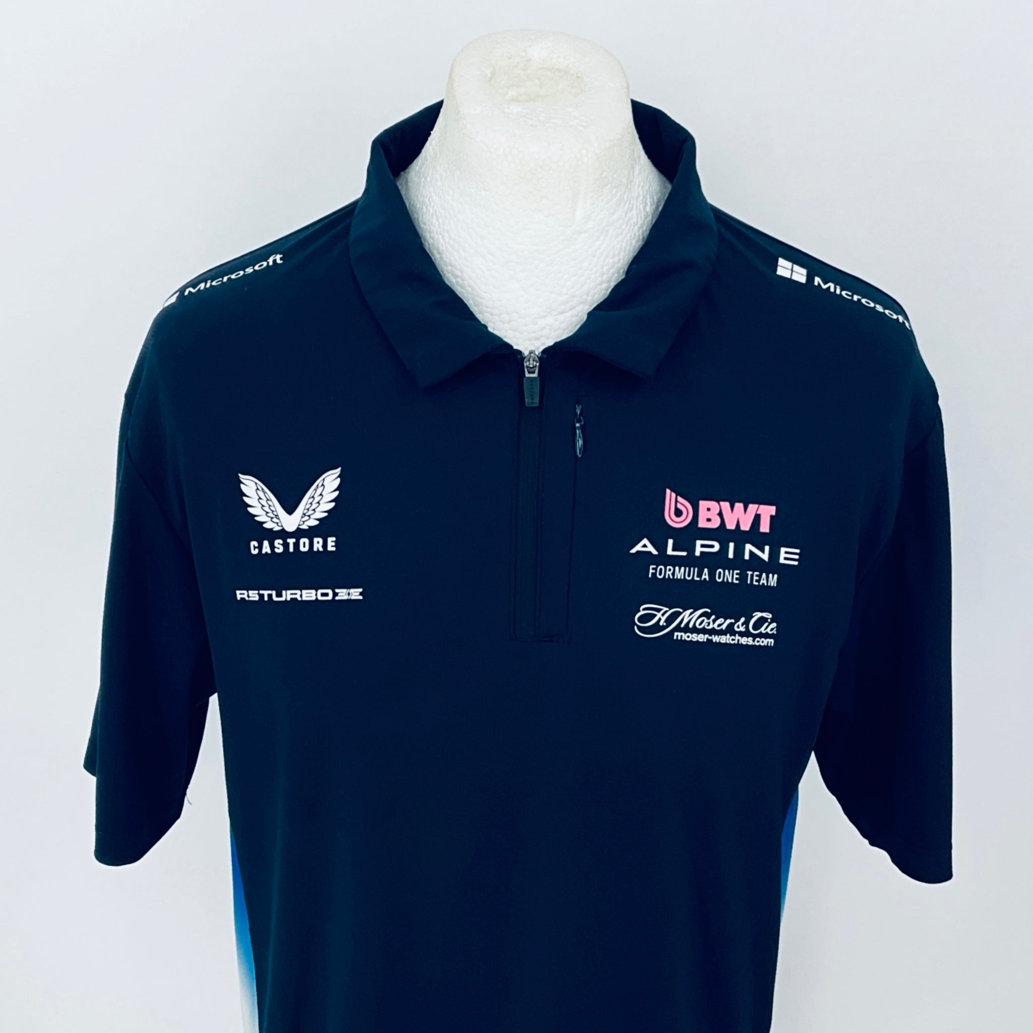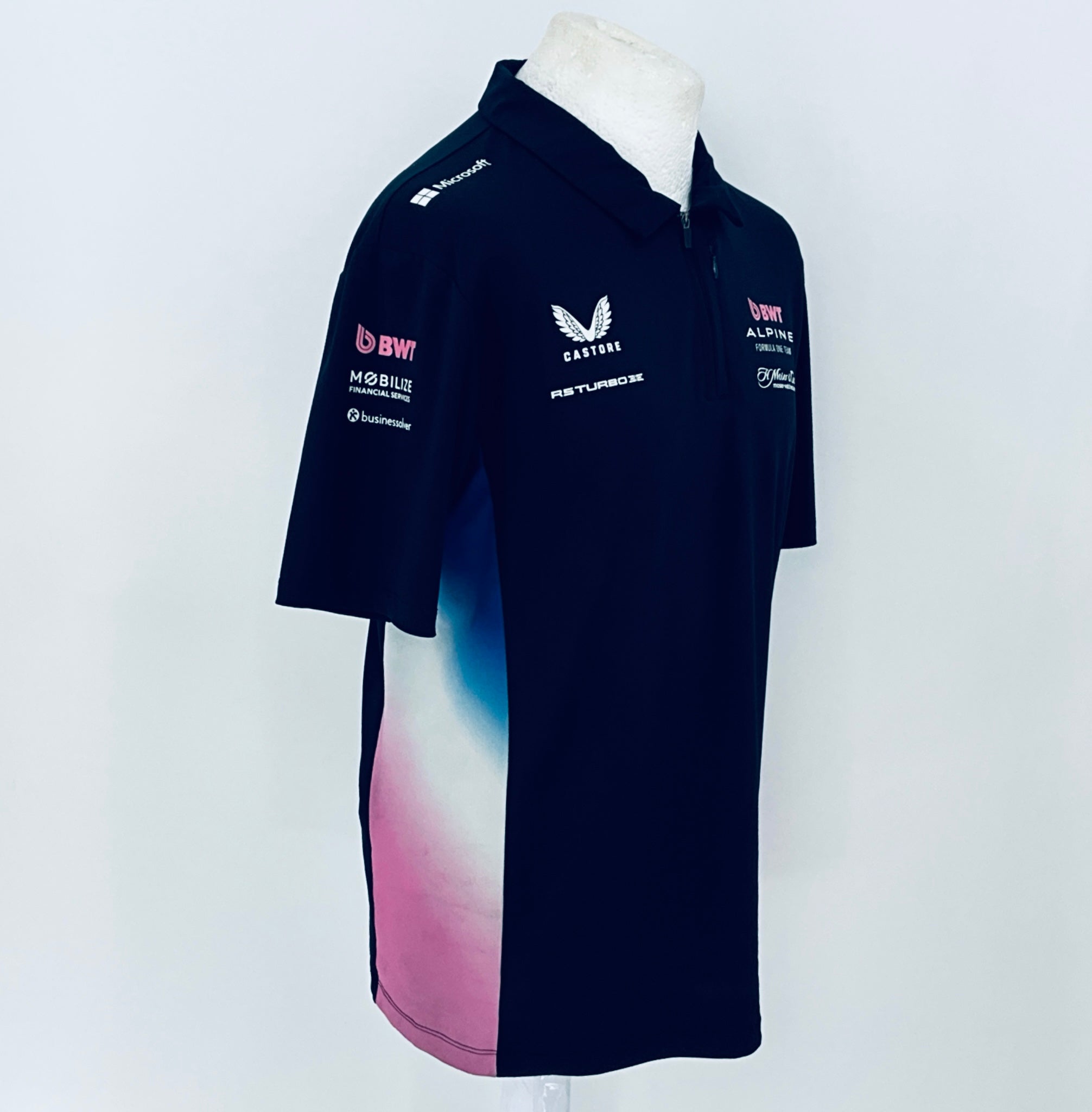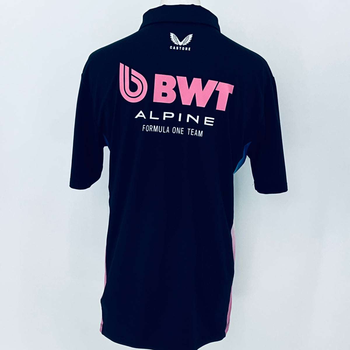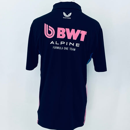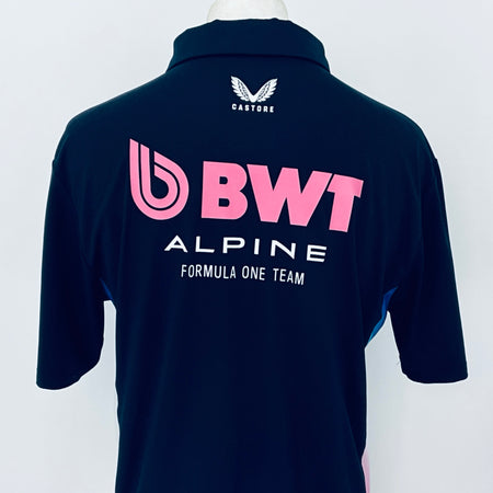 Own an authentic piece of Formula 1 history with this official BWT Alpine F1 Team shirt . Crafted by Castore for team members, this striking shirt features navy blue with nnulti-coloured panelling and trim, complete with printed team and sponsors logos from the 2025 F1 campaign. Originally issued to a team mechanic, it remains unworn in new condition.