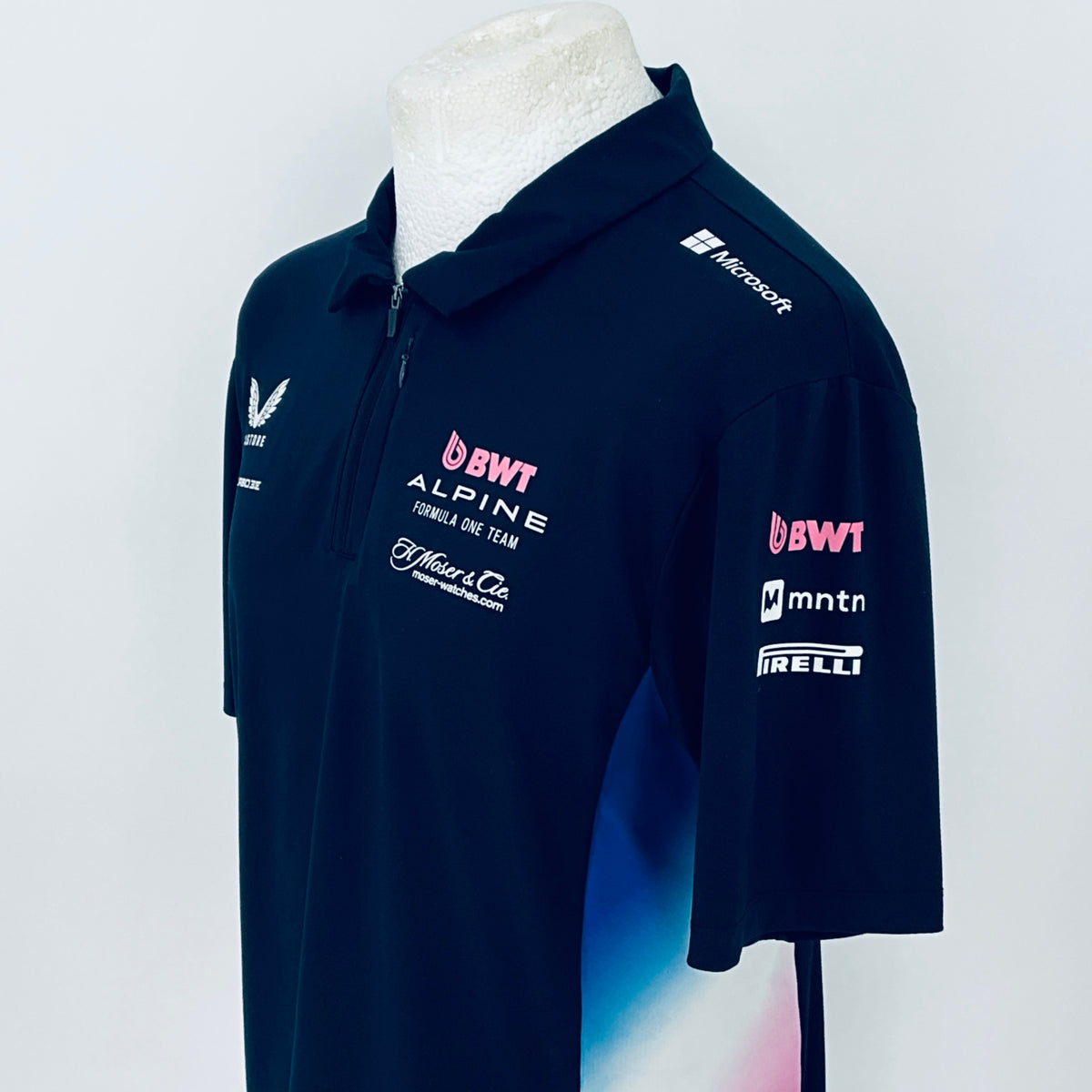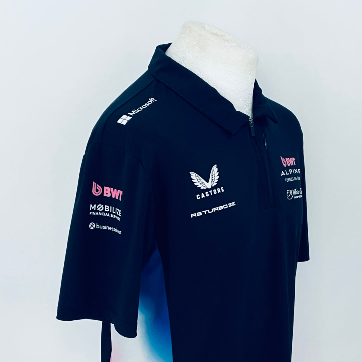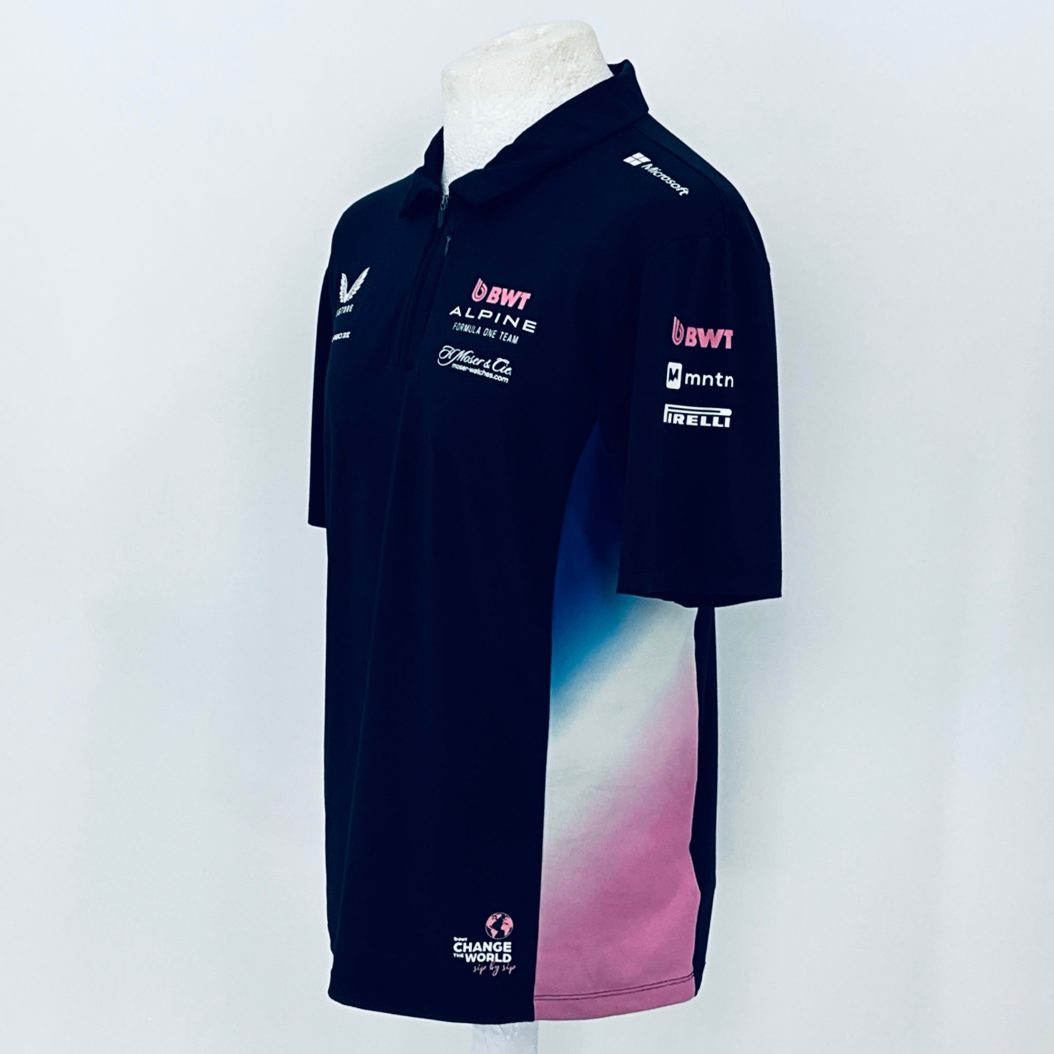 Own an authentic piece of Formula 1 history with this official BWT Alpine F1 Team shirt . Crafted by Castore for team members, this striking shirt features navy blue with nnulti-coloured panelling and trim, complete with printed team and sponsors logos from the 2025 F1 campaign. Originally issued to a team mechanic, it remains unworn in new condition.