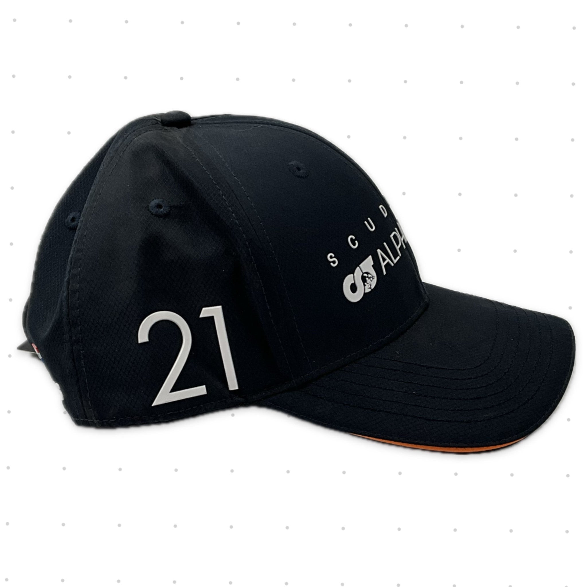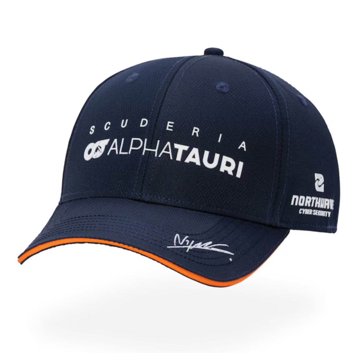 Part of a series of Nyck De Vries Scuderia Alpha Tauri F1 Team official licenced merchandise collection. This top quality cap features the team logos om the crown and back and Nyck's name and race number, sponsors and autograph printed on the peak, sides and rear finished with a snap back closure for an ultimate fit