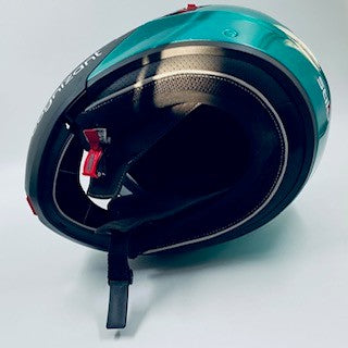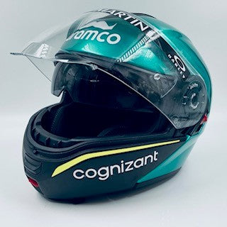 This authentic race-used Stilo helmet was crafted for the Aston Martin AramcoCognizant F1 Team’s 2023 pit crew. Showcasing the iconic metallic British Racing Green with team and sponsor logos, plus black and yellow accents, it combines style with function. Equipped with a head heat vent, visor, retractable tinted sunglasses, and an adjustable chin strap with padding, it offers comfort and safety during those much loved frantic pit-stops. A rare collector’s piece, this genuine team-issued helmet is an essential addition for any Aston Martin or F1 fan seeking a unique and striking memorabilia item.