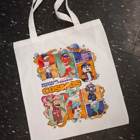 Launched in partnership with Kraken our Cosmos character Tote bag features the Cosmos characters in a large team shot transfer print. The back features the Williams Racing and Puma logo.