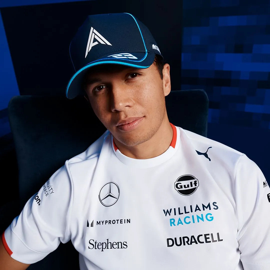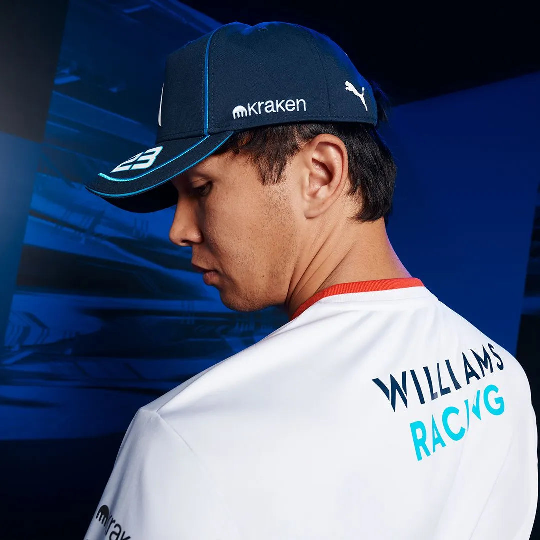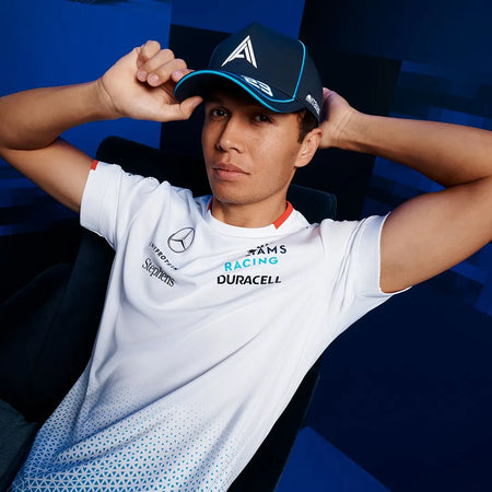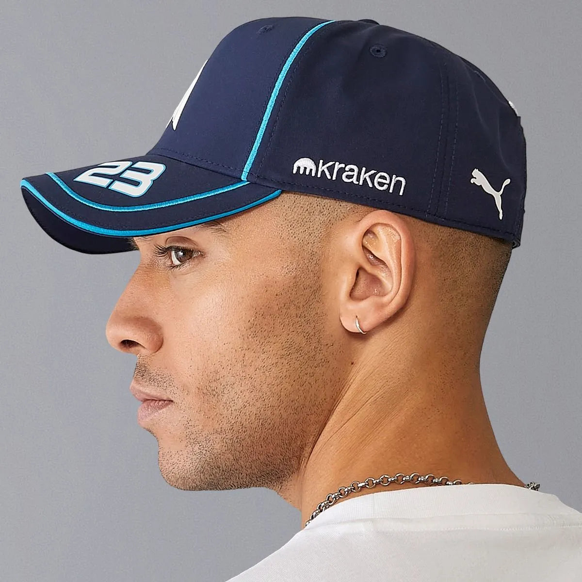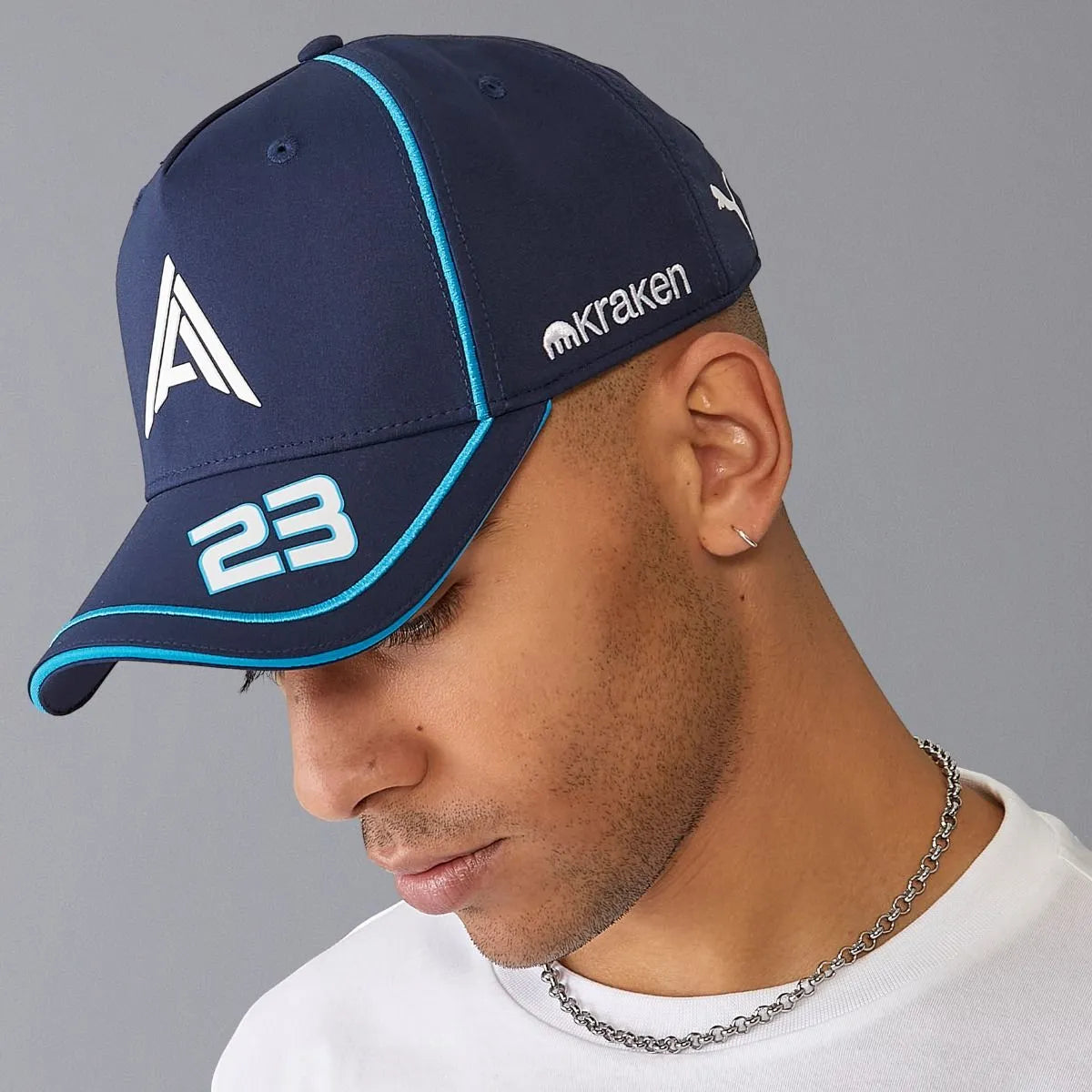 The official 2024 Williams Racing Alex Albon Driver Cap Navy, as worn by Alex throughout the 2024 Formula 1 season. The cap features Alex's 'AA' driver logo on the crown, alongside his driver number 23 on the contrast sandwich peak.