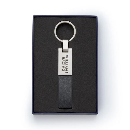 A premium keyring with leather strap and engraved metal Williams Racing logo, supplied in a Williams Racing branded gift box. Part of the official accessory collection.