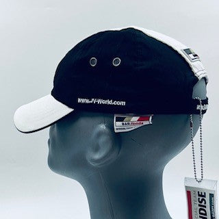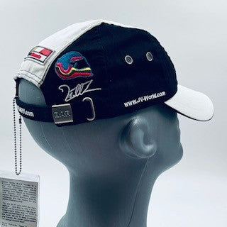 Celebrate the legacy of Jacques Villeneuve with this official BAR Honda F1 Team Drivers Cap. Crafted from 100% cotton, it features Jacques helmet design and signature on the back.. The striking black cap is accented by a central white stripe and a contrasting black under-peak, showcasing the BAR Honda logo on the peak, sides, and back. , finished with a sleek metal clasp. Perfect for passionate F1 fans looking to own a piece of racing heritage.