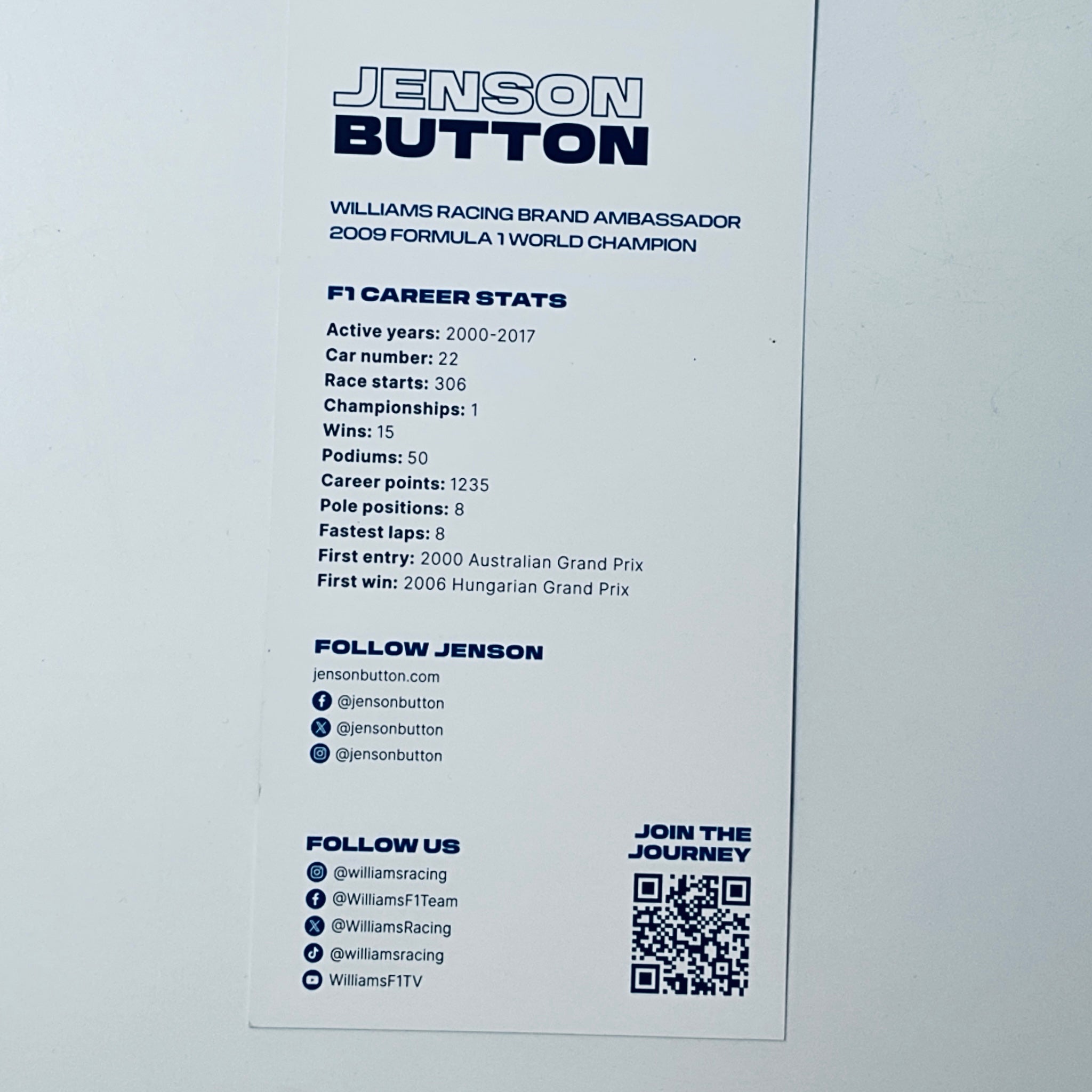 Jenson Button Williams Racing F1 Team Ambassador Drivers Card