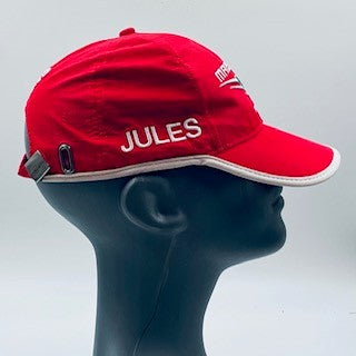 This authentic Joules Bianchi Marussia Racing F1 Team Official Merchandise driver cap is a must-have for any F1 collection. Made from the official Joules driver range, it features the team logo embroidered on the crown and key sponsor on the back. Both sides of the cap are adorned with the Joules name in striking white, providing a sharp contrast to the vibrant Marussia red color. The white peak trim and metal buckle with the team logo further add to the cap's classy appeal. Don't miss out on this rare and highly sought-after item.