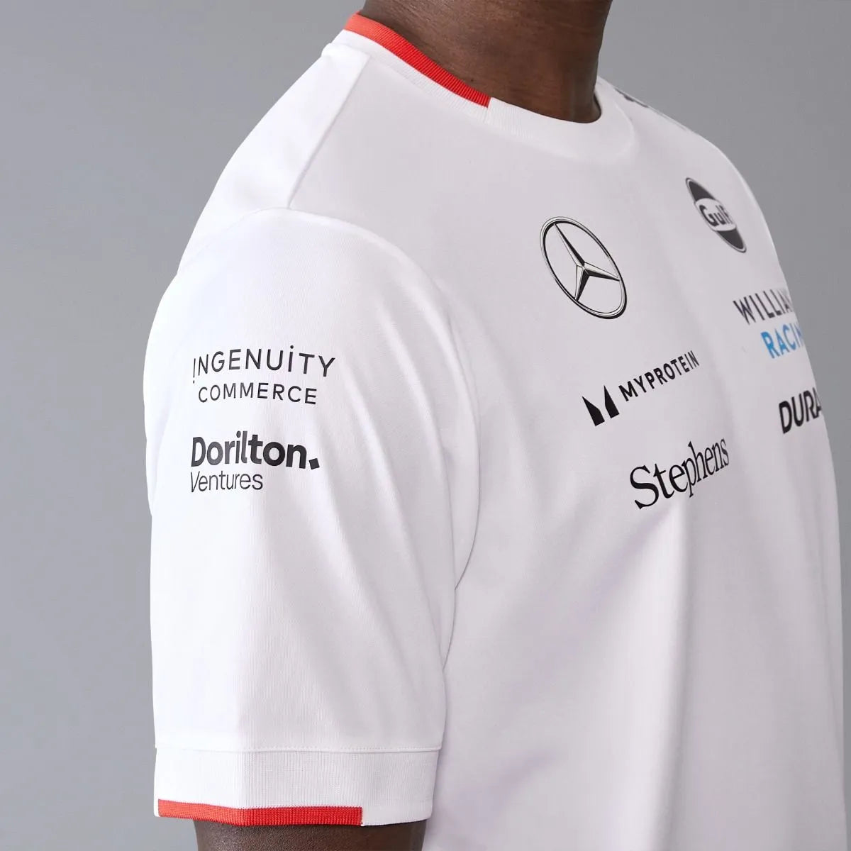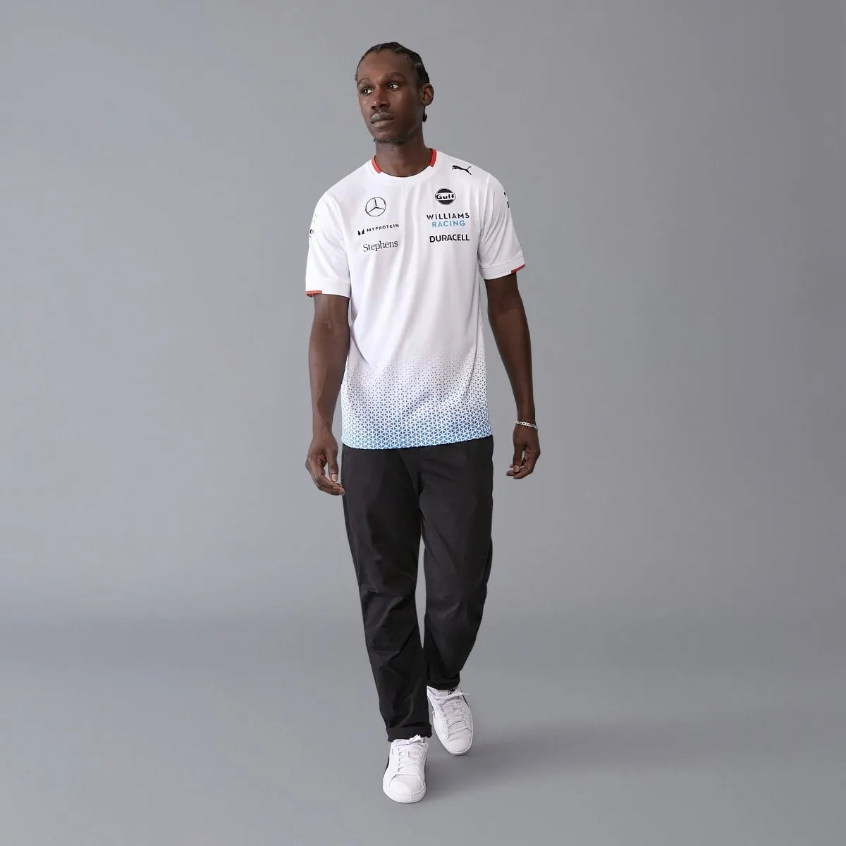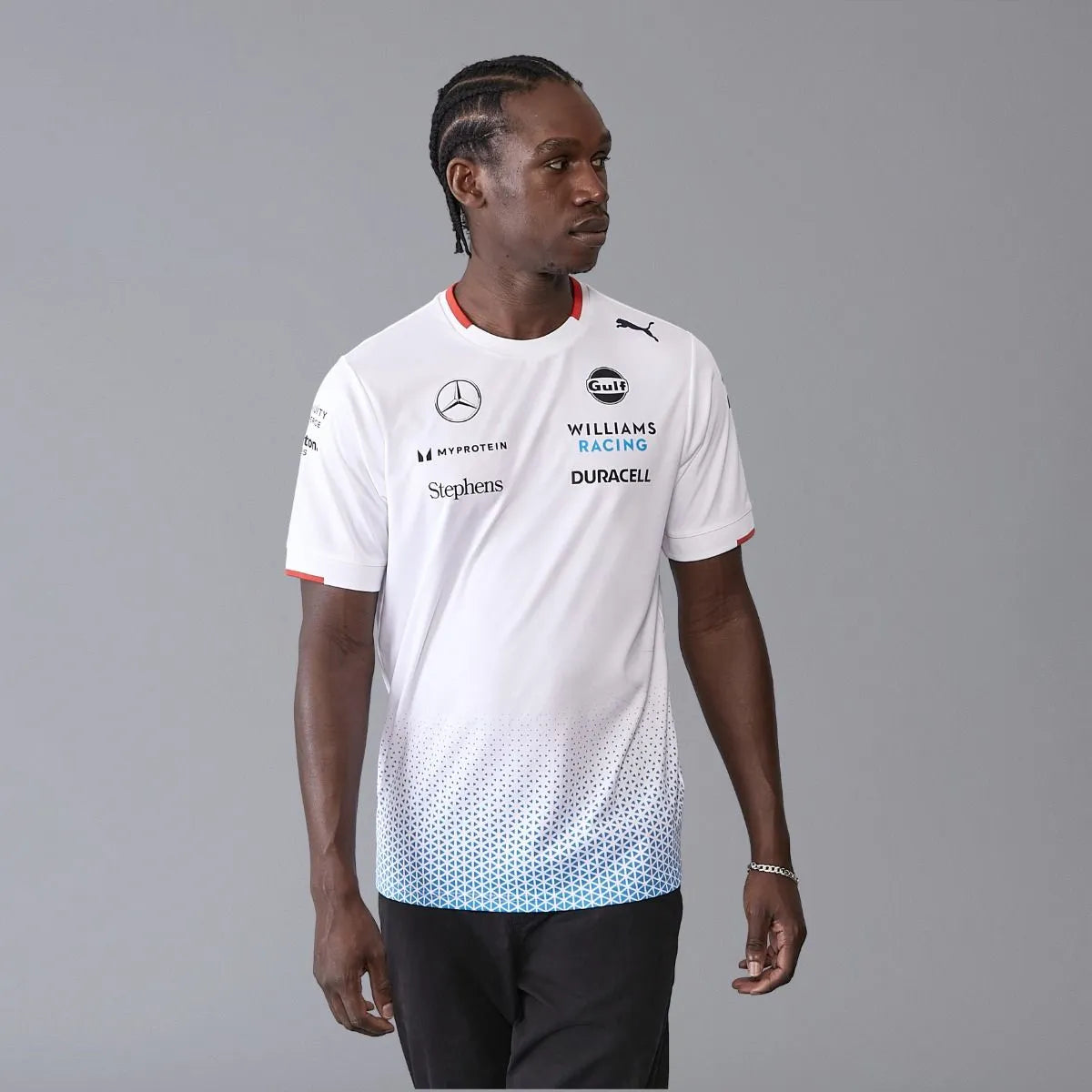 The official 2024 Williams Racing Mens Team Jersey White as worn by Alex Albon and Logan Sargeant. Features the same gradient print seen throughout the 2024 Team collection, alongside all the official team and sponsor branding from the 2024 Formula 1 season.