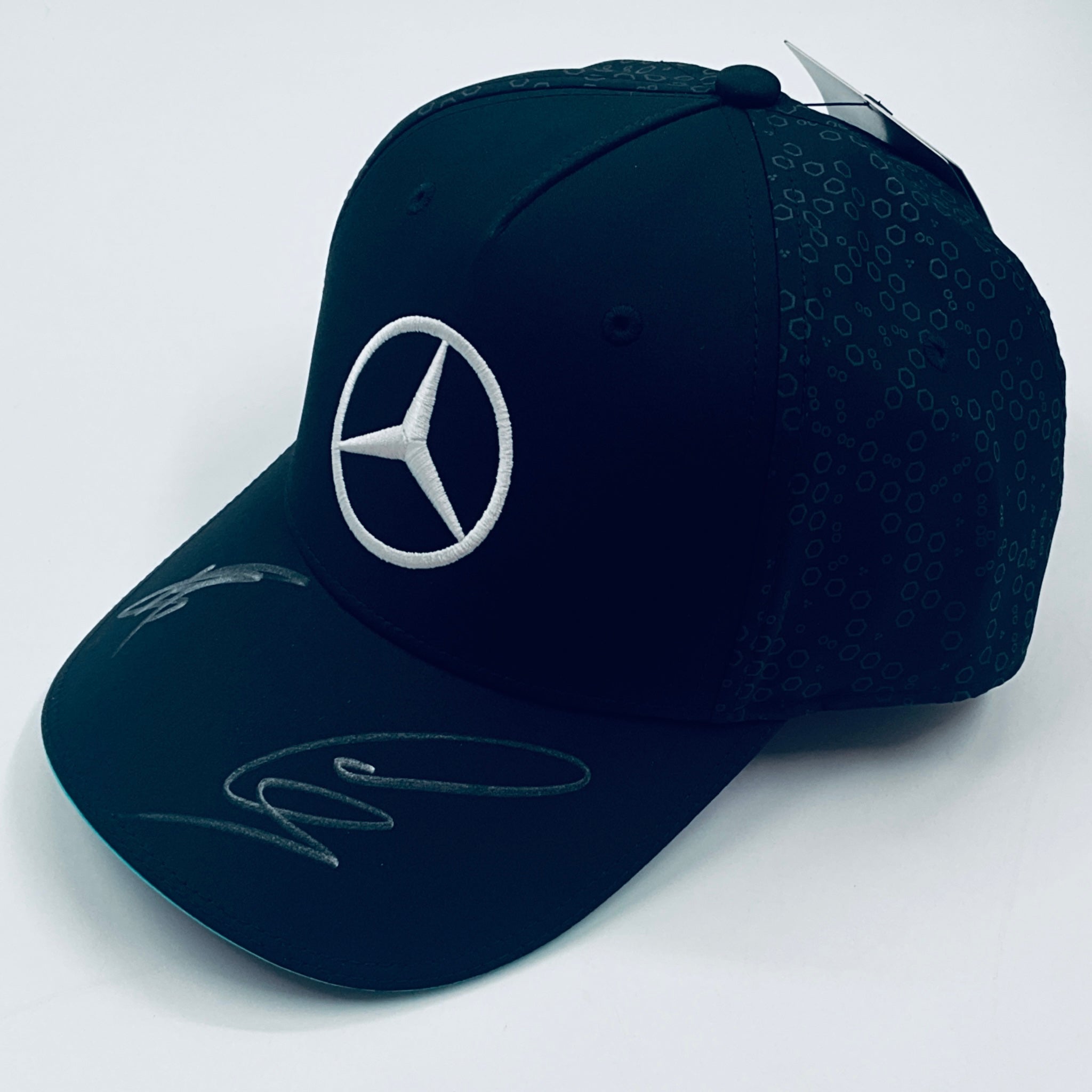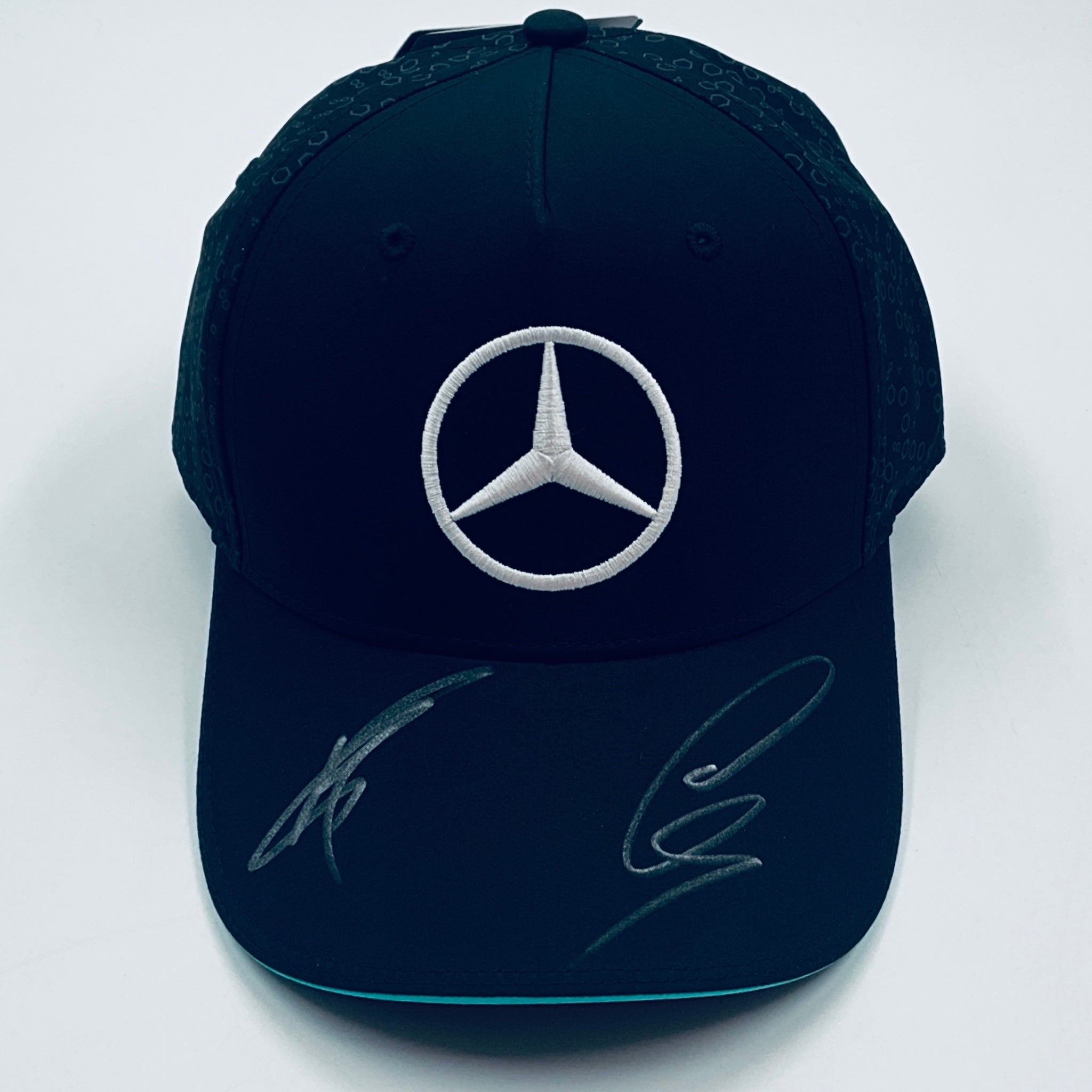 Own a genuine Lewis Hamilton & George Russell hand-signed official Mercedes F1 Team cap, personally autographed by both Lewis Hamilton and George Russell the Mercedes F1 Team 2024 driver pairing with beautiful clear and well positioned signatures with a crisp silver pen. This striking piece of F1 memorabilia is perfect for any motorsport fan looking to enhance their collection with an authentic and eye-catching item. Don’t miss the chance to own a unique keepsake from a top Formula 1 driver.