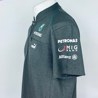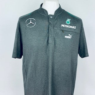 This authentic Mercedes AMG Petronas Formula One Team Issue Puma Race Day Shirt was designed by Puma specifically for team members and was never released to the public. Made from high-quality materials, this shirt boasts a Mercedes-Benz grey with teal detailing showcases printed logos of the team and their sponsors. As a rare and desirable item, it is a must-have for any Mercedes or F1 fan.
