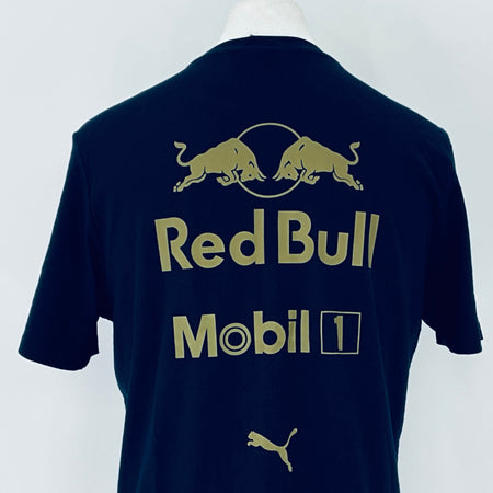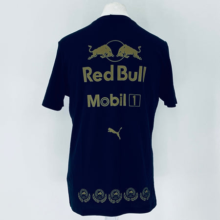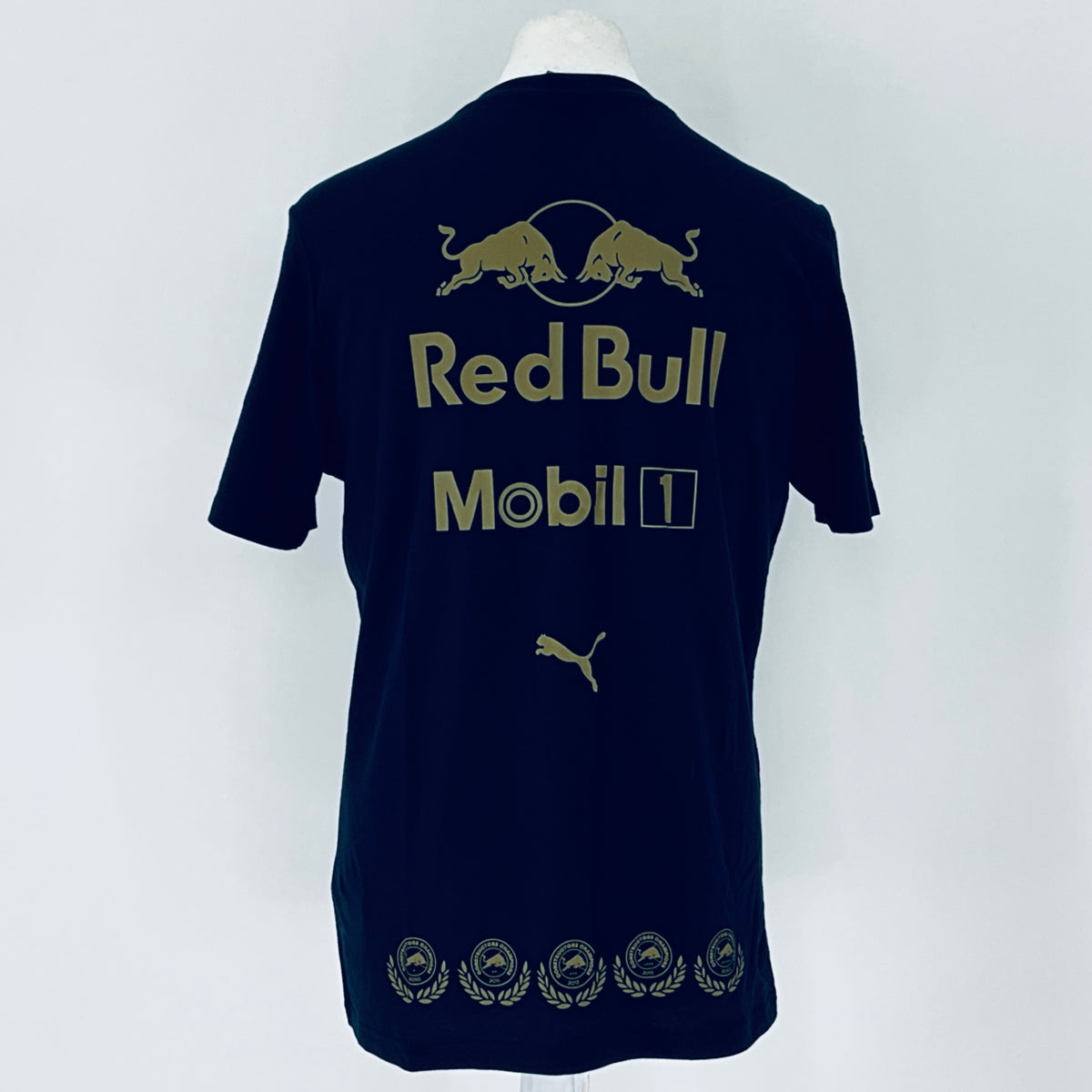 This genuine and authentic Oracle Red Bull Racing F1 Tram issue pit crew 5 Times World Champion T-shirt, issued to team members to celebrate his landmark.designed by Puma for the team, combines quality style, and practicality. This ultra rare and desirable is an essential item for any Max Verstappen, Red Bull Racing or F1 fan looking to enhance their collection with officially crafted team gear.