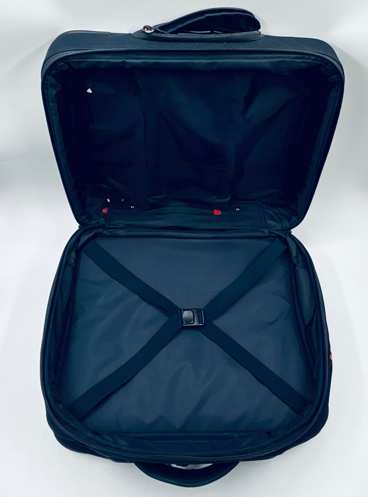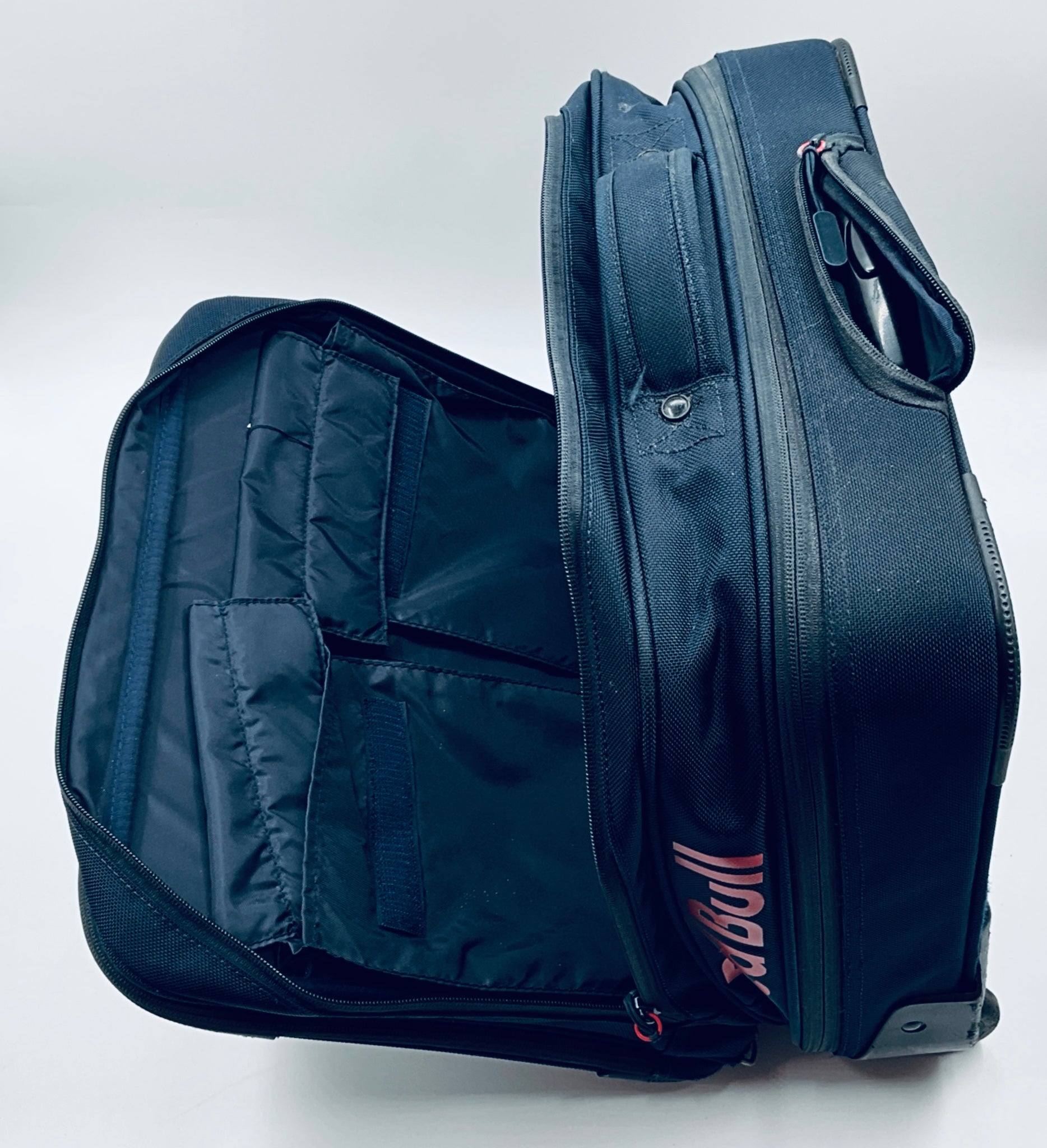 This authentic Oracle Red Bull Racing F1 Team pit crew wheelie cabin bag is specially crafted to meet cabin luggage size requirements, offering ample space for clothes and electronics like laptops. Stylish and robust, it features a fold-away handle and multiple internal and external compartments, all made from premium materials. Not available to the public, this exclusive bag perfectly blends quality, design, and functionality. A must-have for any Red Bull Racing or F1 enthusiast wanting to own official team merchandise and elevate their collection.