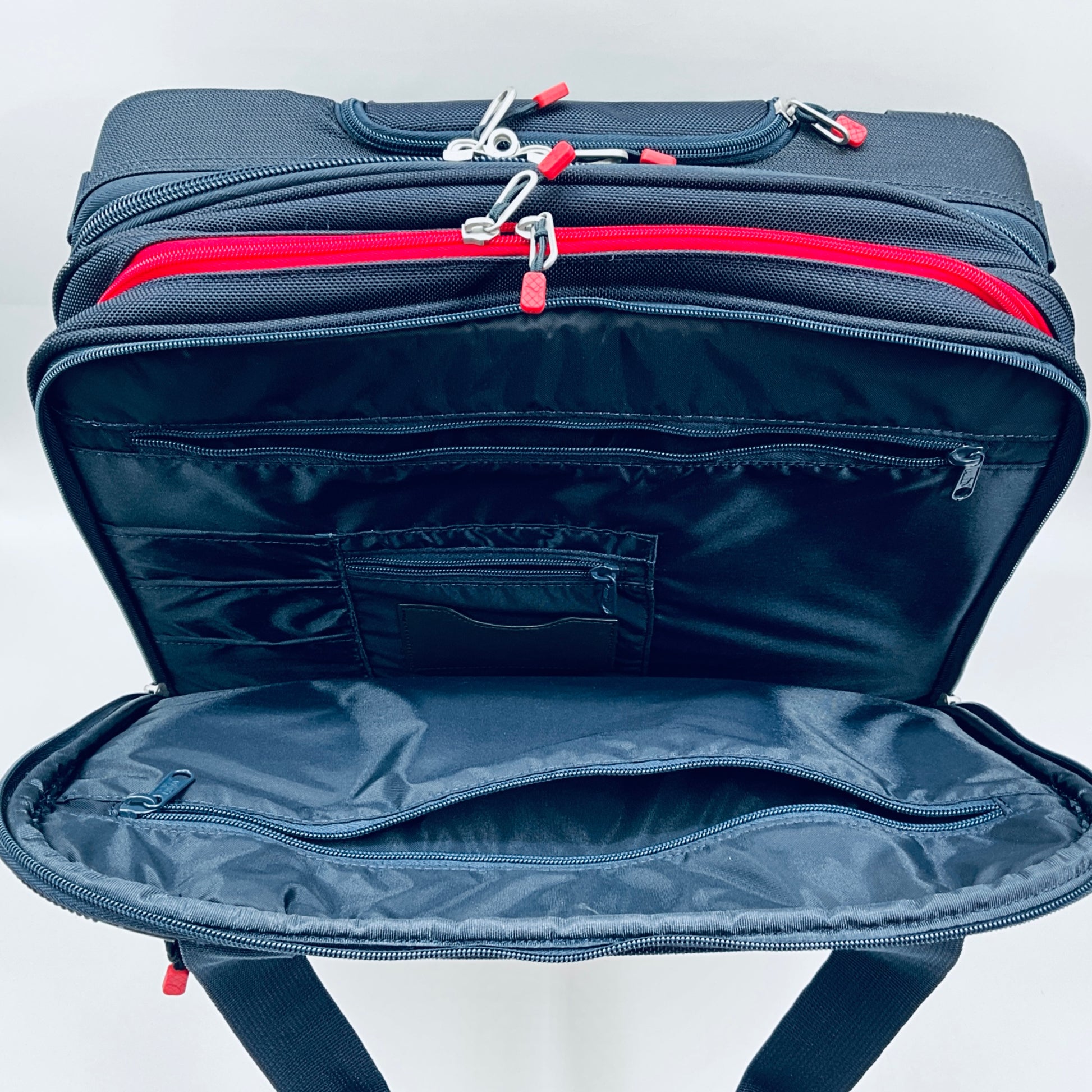 This authentic Aston Martin Red Bull Racing F1 Team team member wheelie laptop bag is specially crafted to meet luggage size requirements, offering ample space for important items and electronics like laptops. Stylish and robust, it features a fold-away handle and multiple internal and external compartments, all made from premium materials. Not available to the public, this exclusive bag perfectly blends quality, design, and functionality. A must-have for any Red Bull Racing or F1 enthusiast wanting to own official team merchandise and elevate their collection.