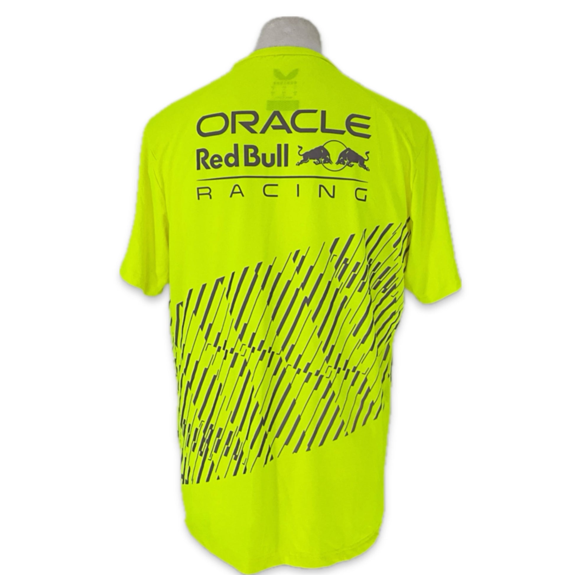 This genuine and authentic Oracle Red Bull Racing F1 Tram issue pit crew race day hi-vis t-shirt, from the 2023 F1 season designed by Castore for the team, combines quality style, and practicality. This rare and desirable is an essential item for any Red Bull Racing or F1 fan looking to enhance their collection with officially crafted team gear.