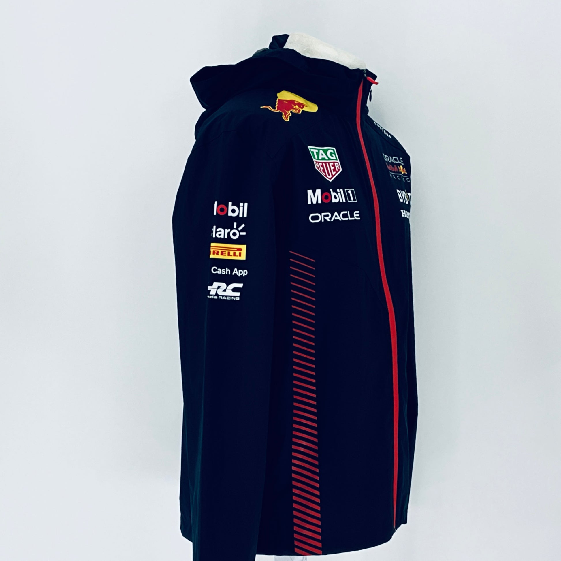 This genuine and authentic Oracle Red Bull Racing F1 Tram issue pit crew race day Hooded rain jacket, from the 2023 F1 season designed by Castore for the team, combines quality style, and practicality. This rare and desirable is an essential item for any Red Bull Racing or F1 fan looking to enhance their collection with officially crafted team gear.