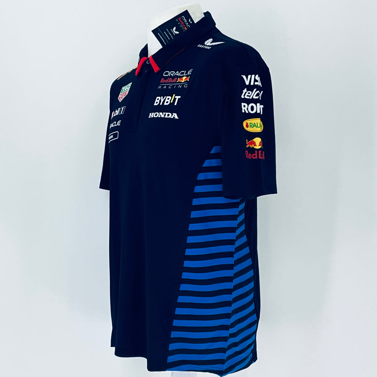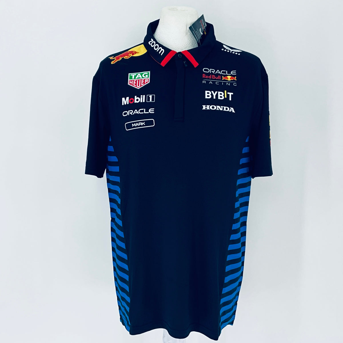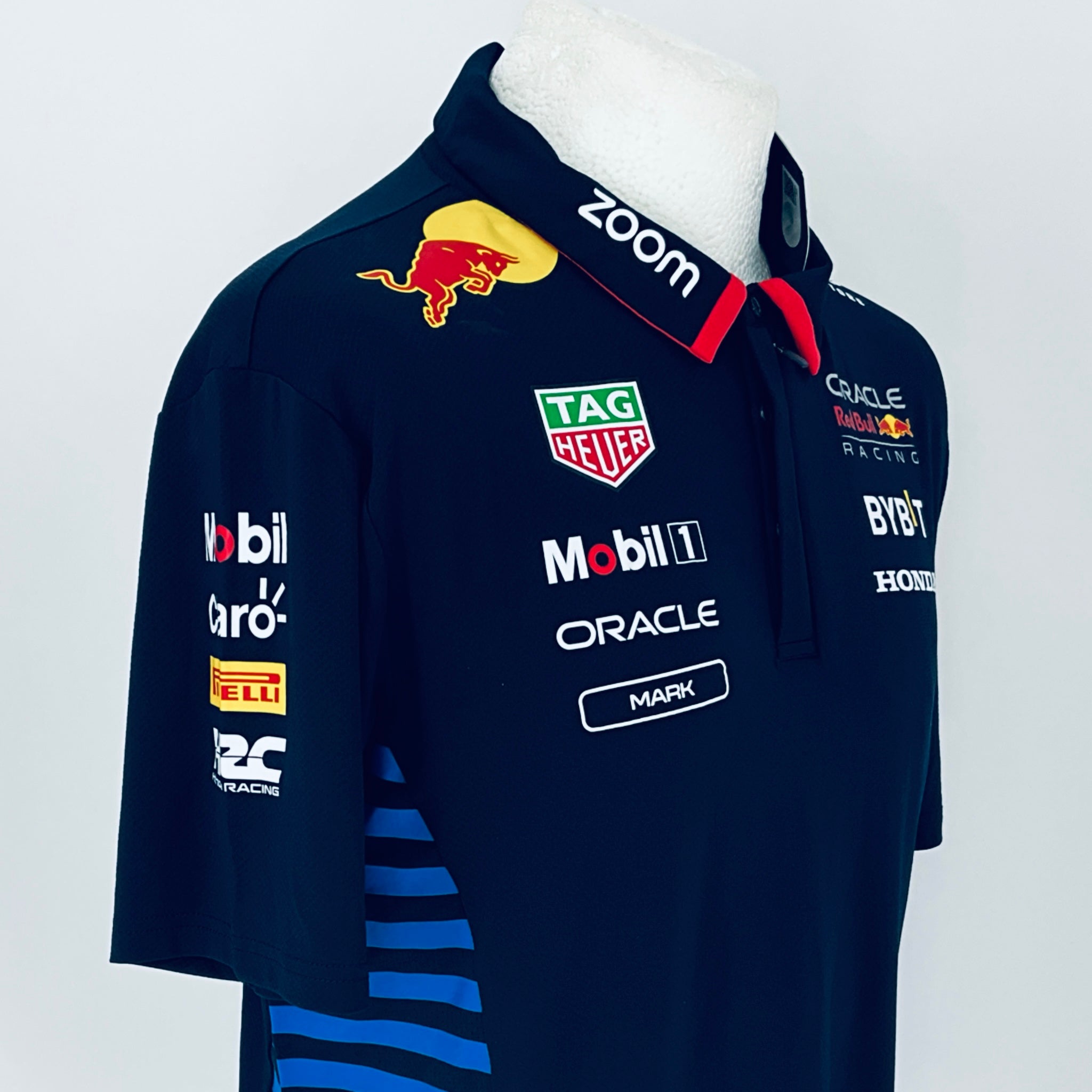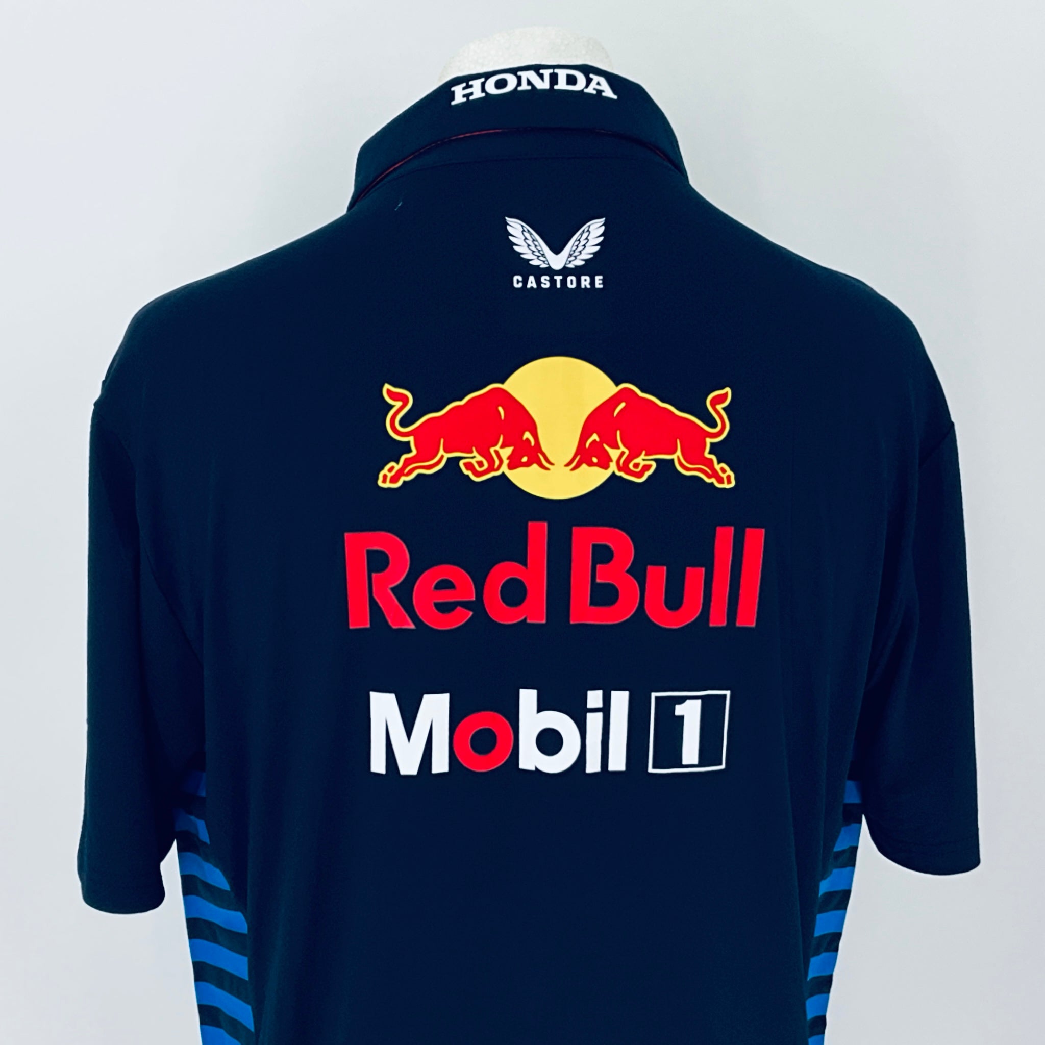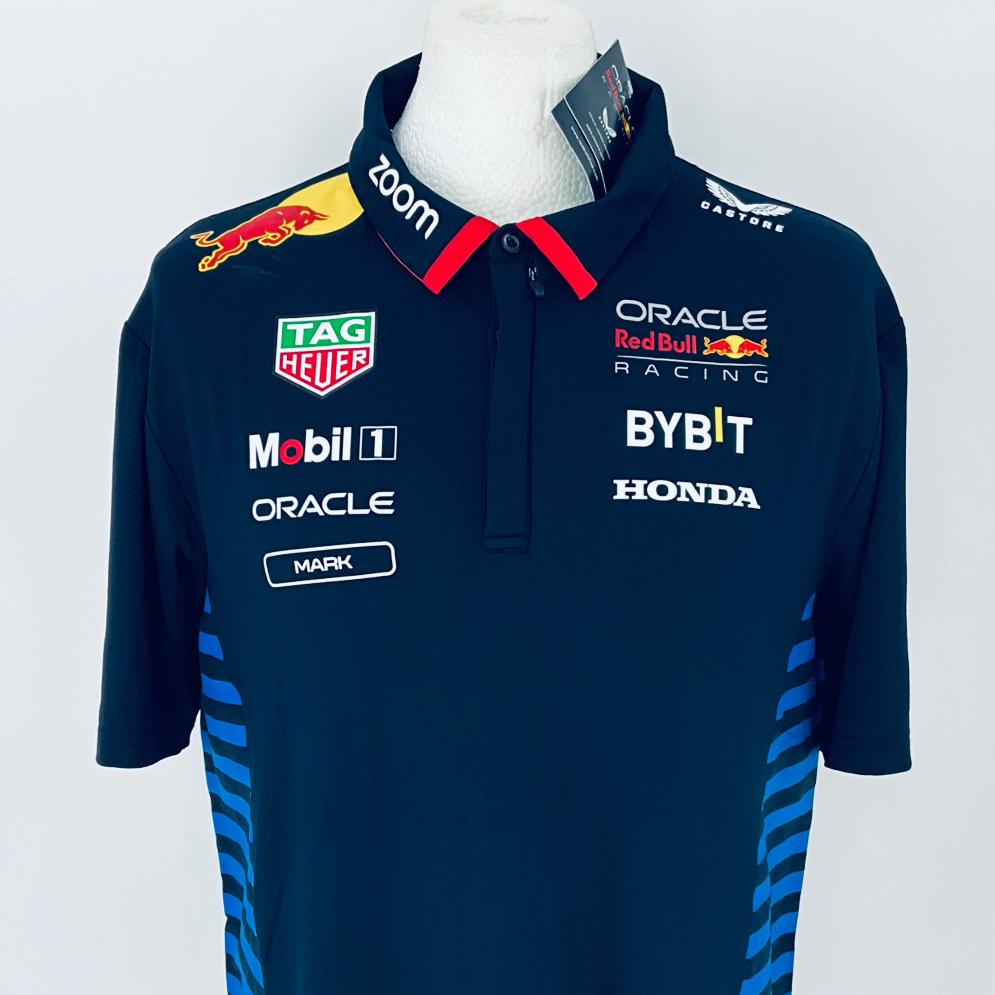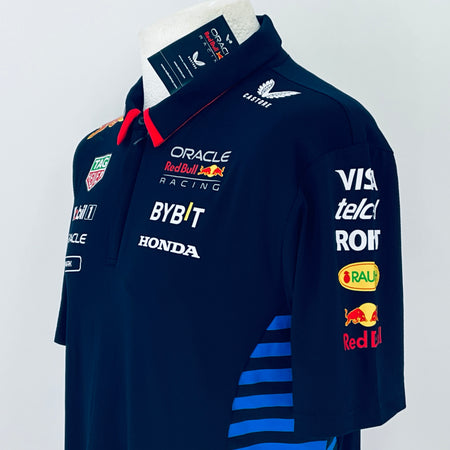 This genuine and authentic Oracle Red Bull Racing F1 Tram issue pit crew race day polo shirt, from the 2024 F1 season designed by Castore for the team, combines quality style, and practicality. This rare and desirable is an essential item for any Red Bull Racing or F1 fan looking to enhance their collection with officially crafted team gear.