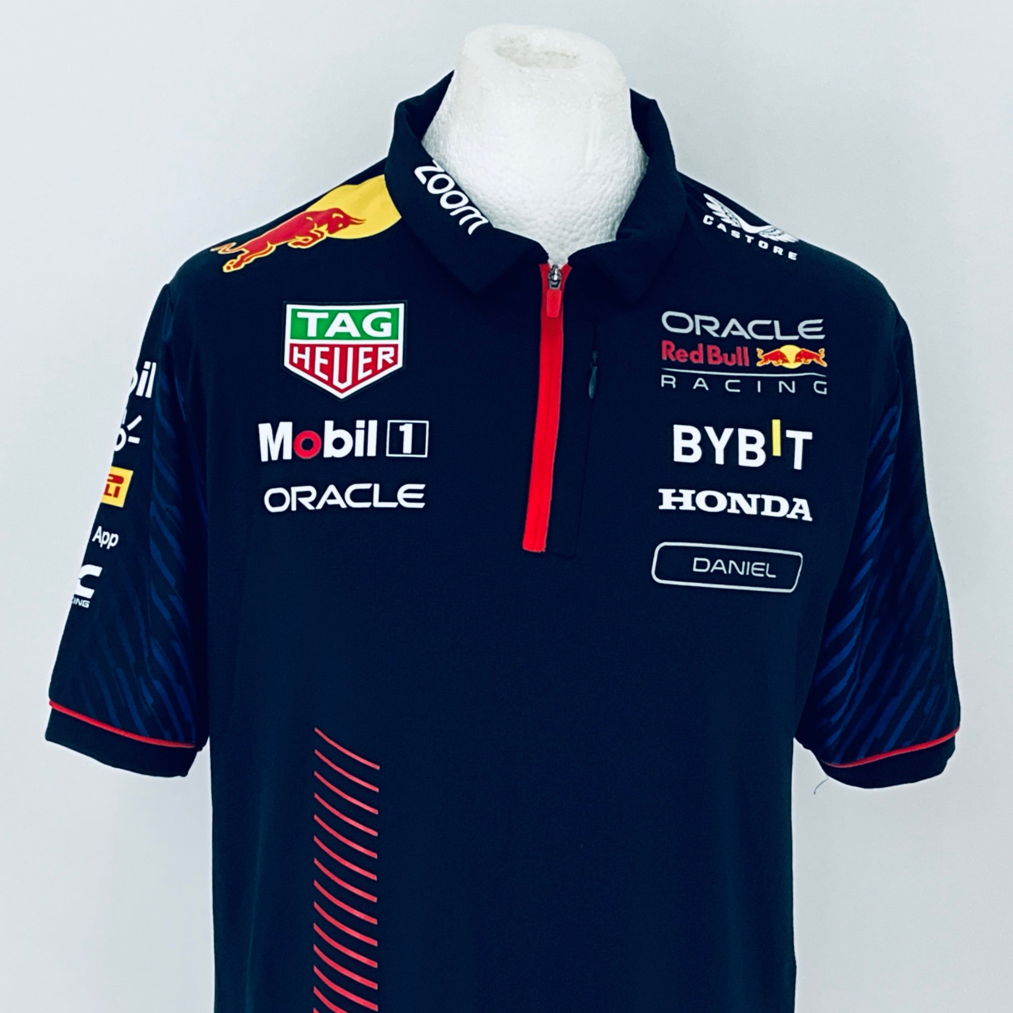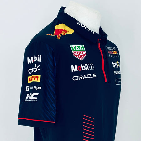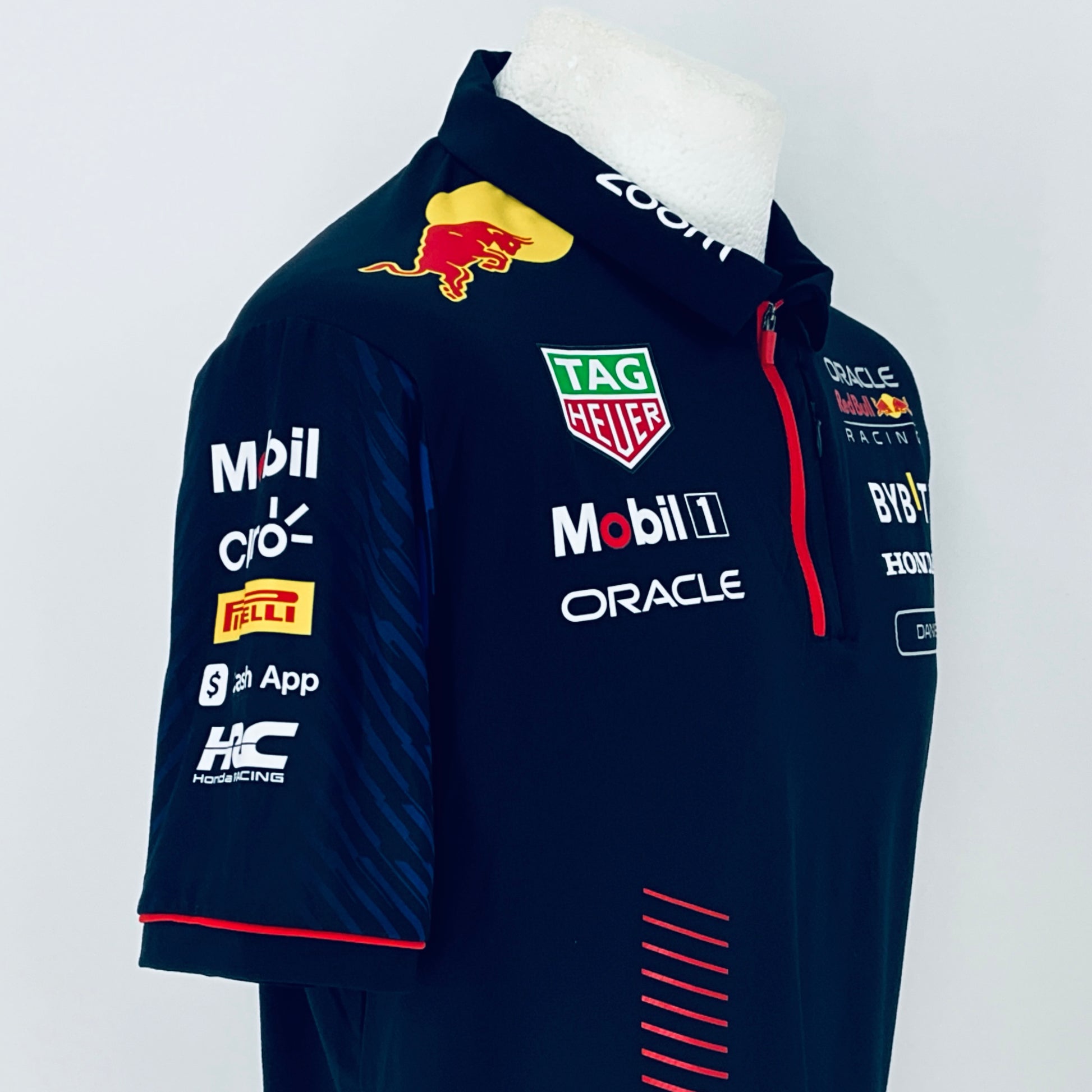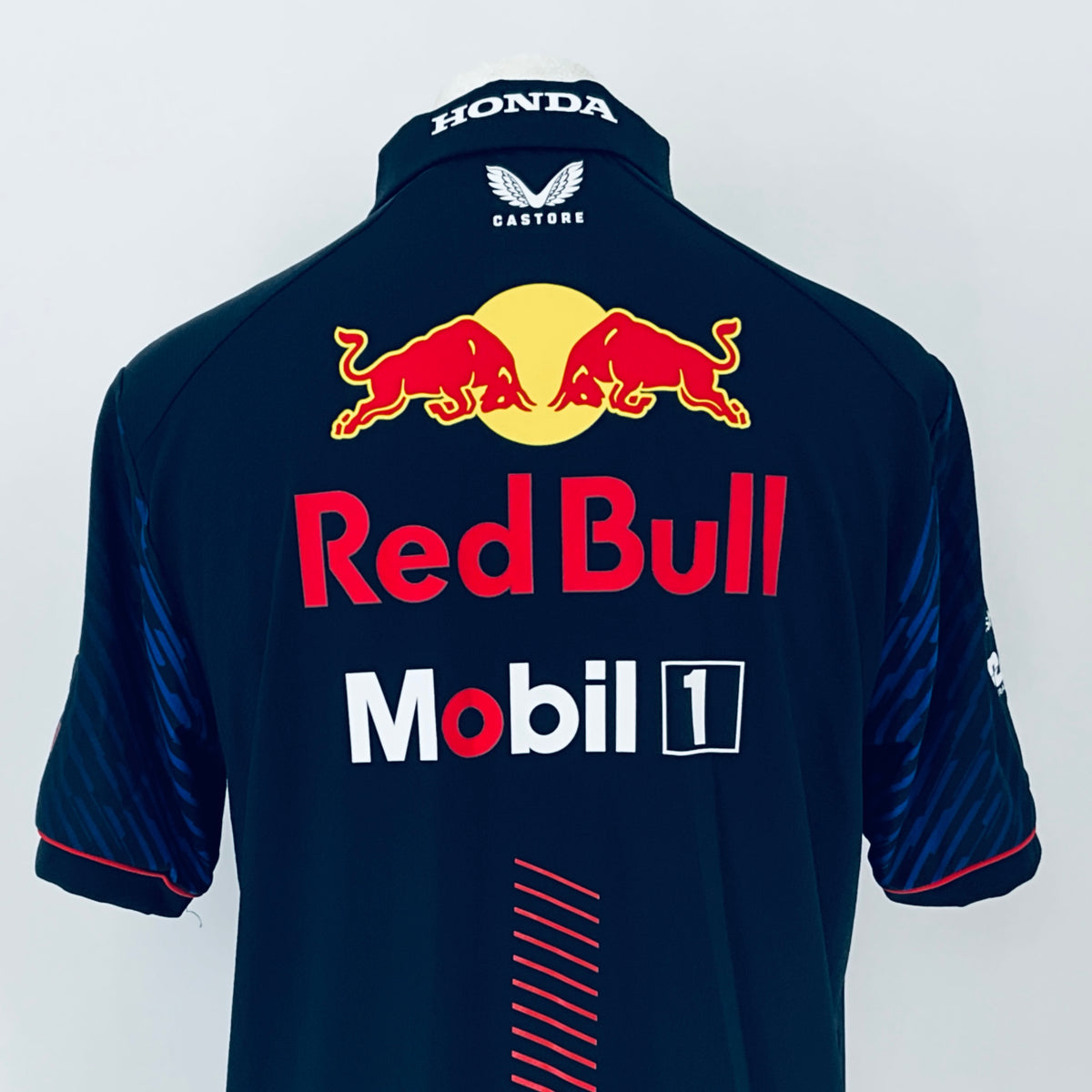 This genuine and authentic Oracle Red Bull Racing F1 Tram issue pit crew race day polo shirt, from the 2023 F1 season designed by Castore for the team, combines quality style, and practicality. This rare and desirable is an essential item for any Red Bull Racing or F1 fan looking to enhance their collection with officially crafted team gear.