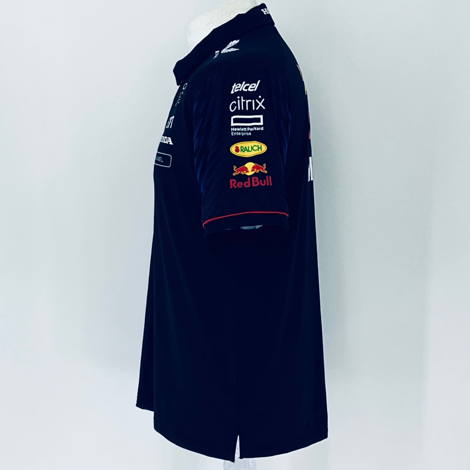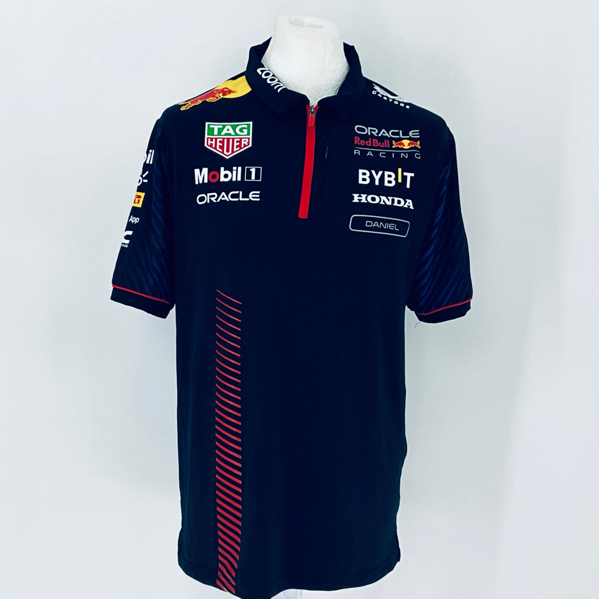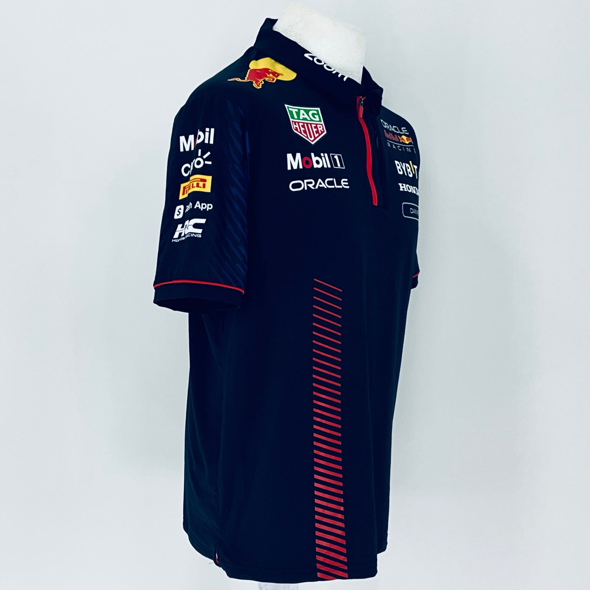 This genuine and authentic Oracle Red Bull Racing F1 Tram issue pit crew race day polo shirt, from the 2023 F1 season designed by Castore for the team, combines quality style, and practicality. This rare and desirable is an essential item for any Red Bull Racing or F1 fan looking to enhance their collection with officially crafted team gear.