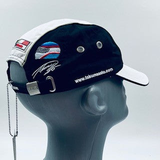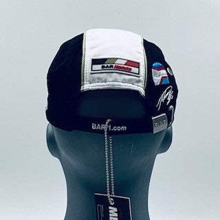 Celebrate the legacy of Takuma Sato with this official BAR Honda F1 Team Drivers Cap. Crafted from 100% cotton, it features Takuma’s helmet design and signature on the back, along with his race number 4. The striking black cap is accented by a central white stripe and a contrasting black under-peak, showcasing the BAR Honda logo on the peak, sides, and back. Helmet motif and racing numbers decorate the side near the closure, finished with a sleek BAR embossed metal clasp. Perfect for passionate F1 fans looking to own a piece of racing heritage.
