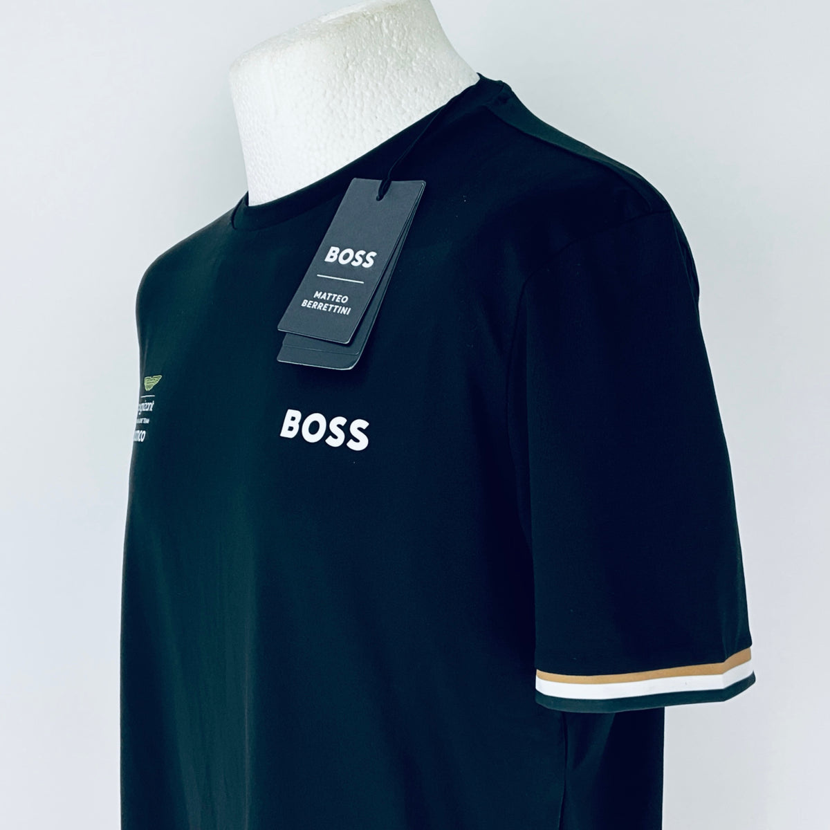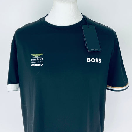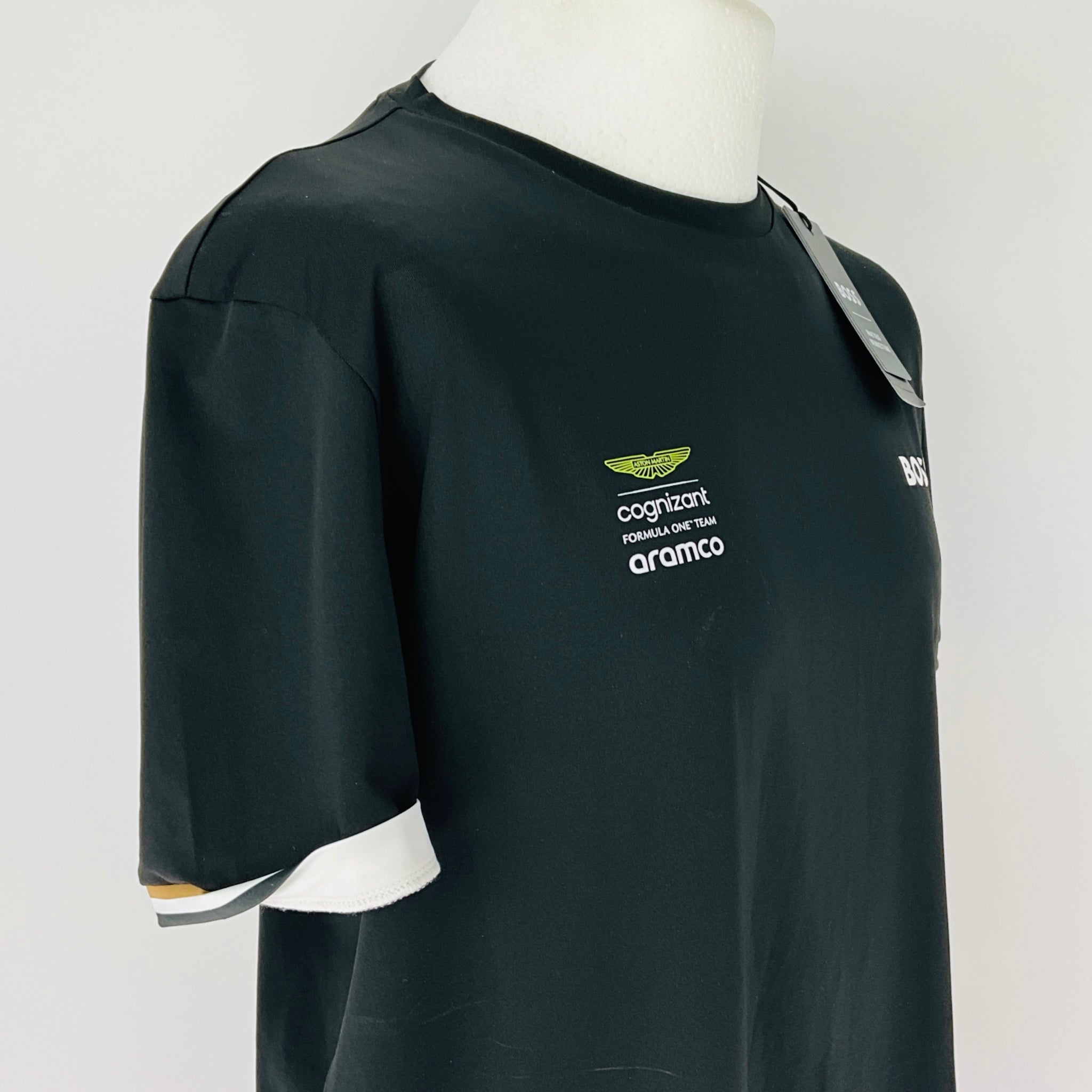This authentic team issue Cognizant Aston Martin Racing F1 Team Aromco t-shirt, crafted exclusively by designer BOSS for the team and not available to the public, is a standout piece. Featuring striking black fabric with the team’s logos alongside the BOSS emblem highlighted in white and gold, it’s an essential and coveted item for any Aston Martin or F1 fan’s collection.