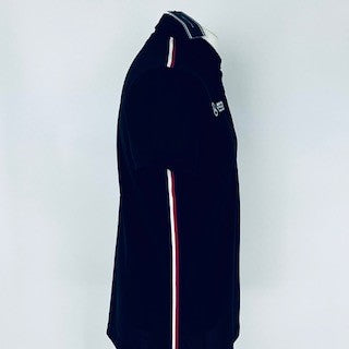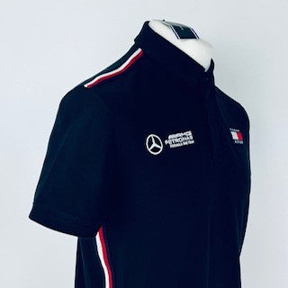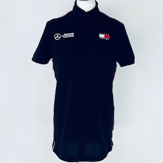 This genuine Mercedes AMG Petronas Formula One Team polo shirt, crafted exclusively by Tommy Hilfiger for the team, is not available to the public. Made from premium 100% cotton, this classic black polo features striking red and white accents along the sides and shoulders. Embroidered logos add a touch of sophistication, making this shirt an essential piece for any dedicated Mercedes or F1 fan.