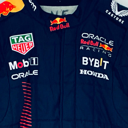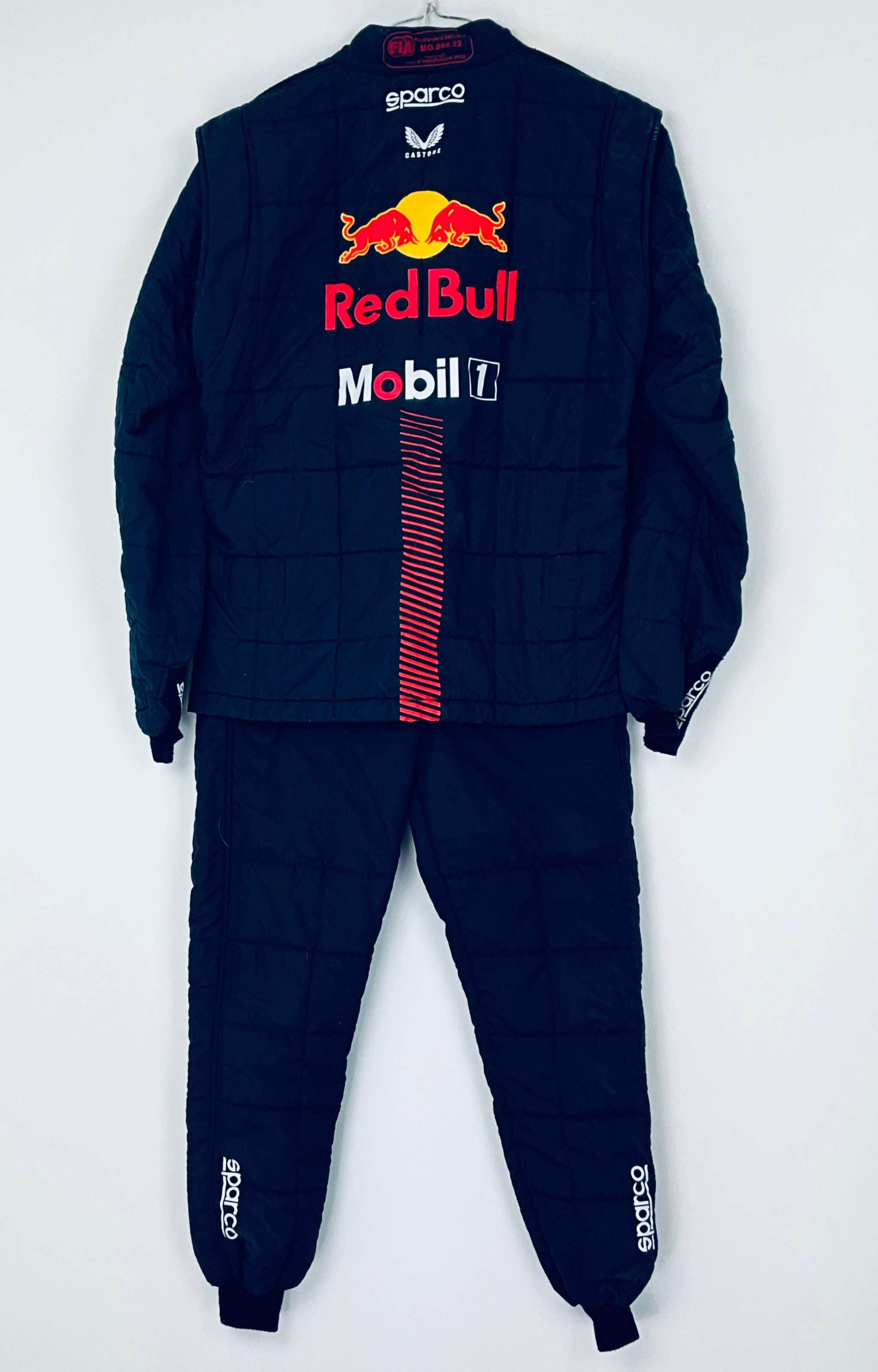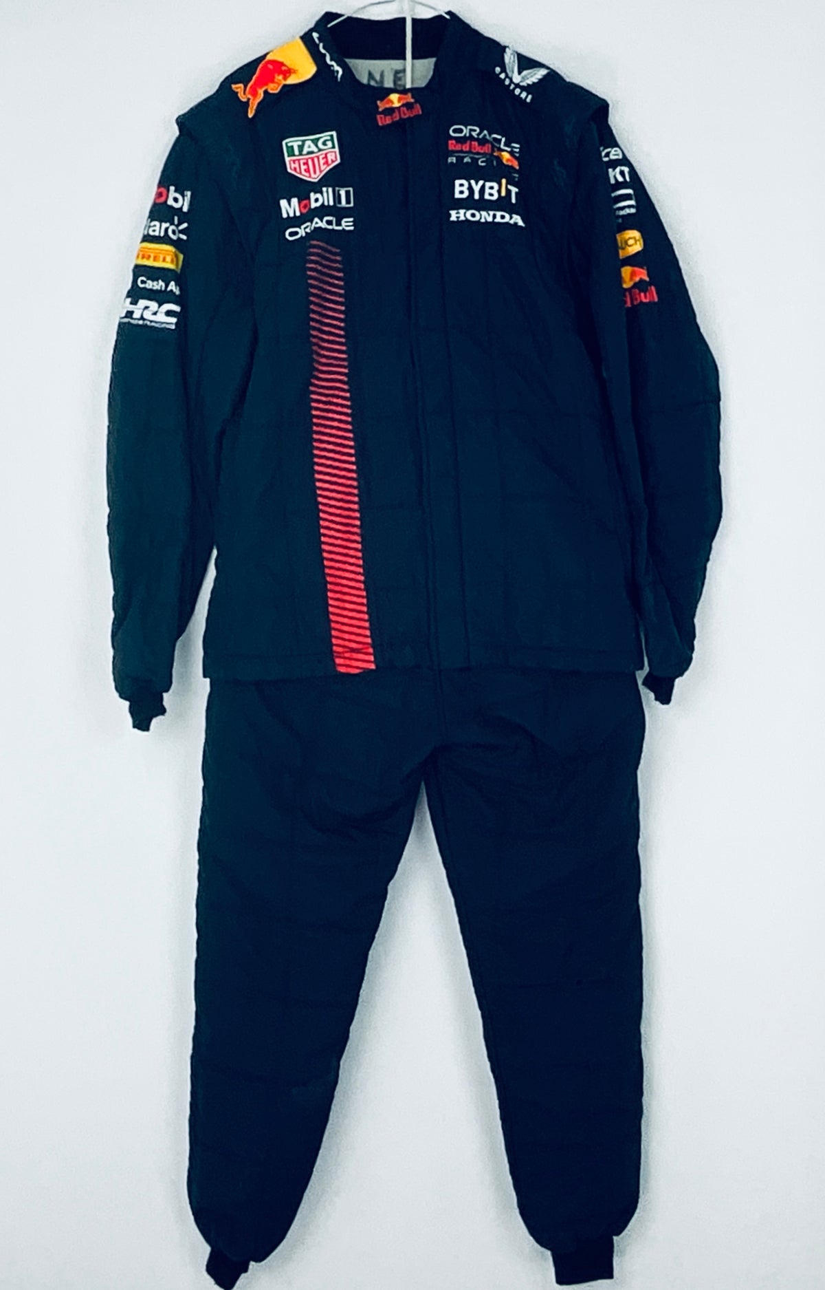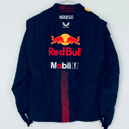 This genuine 2023 team-issued two-piece suit was crafted by Puma exclusively for the Red Bull Racing F1 Team’s Front Jack Operators crew, responsible for servicing Max Verstappen and Sergio Perez’s cars. Featuring a striking stripe pattern in Red Bull red on navy, it proudly displays official team logos and sponsor branding from the 2023 season. A rare and highly sought-after piece, this suit is perfect for any dedicated Red Bull Racing fan or F1 memorabilia collector.