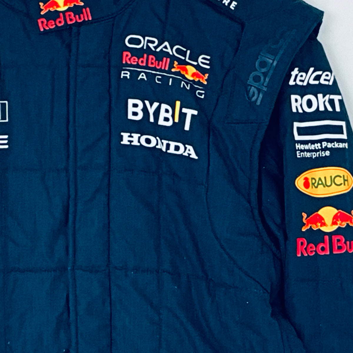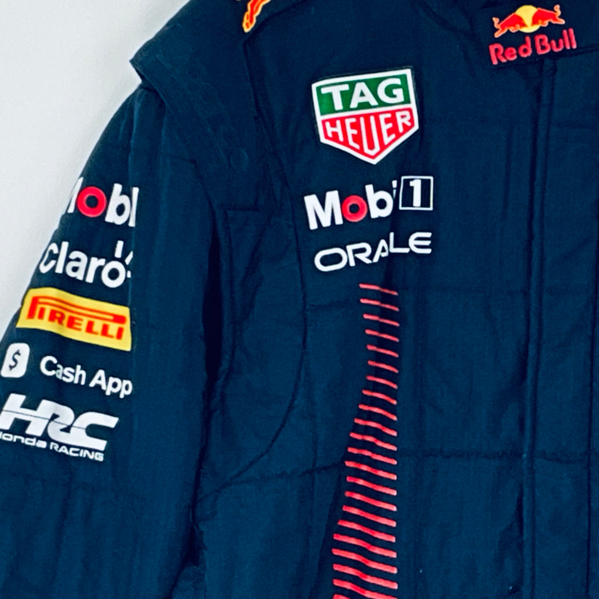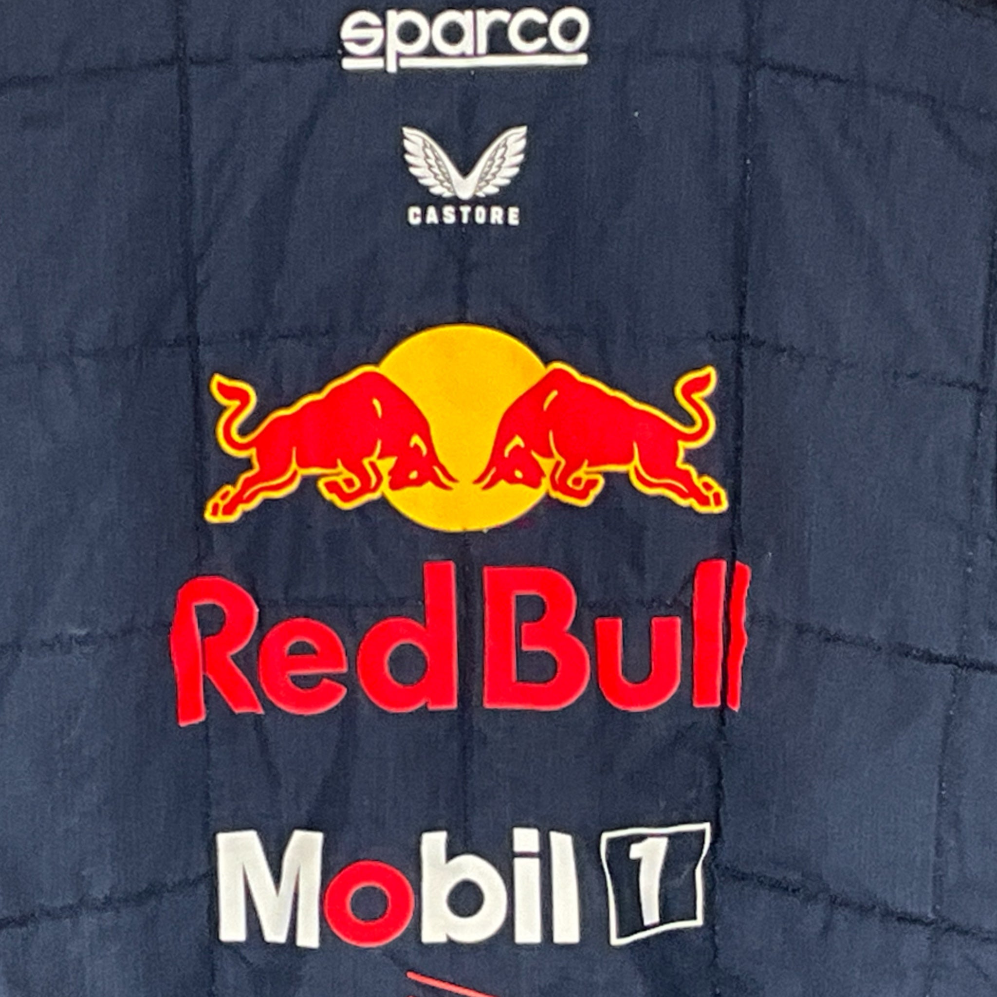 This genuine 2023 team-issued two-piece suit was crafted by Puma exclusively for the Red Bull Racing F1 Team’s Front Jack Operators crew, responsible for servicing Max Verstappen and Sergio Perez’s cars. Featuring a striking stripe pattern in Red Bull red on navy, it proudly displays official team logos and sponsor branding from the 2023 season. A rare and highly sought-after piece, this suit is perfect for any dedicated Red Bull Racing fan or F1 memorabilia collector.