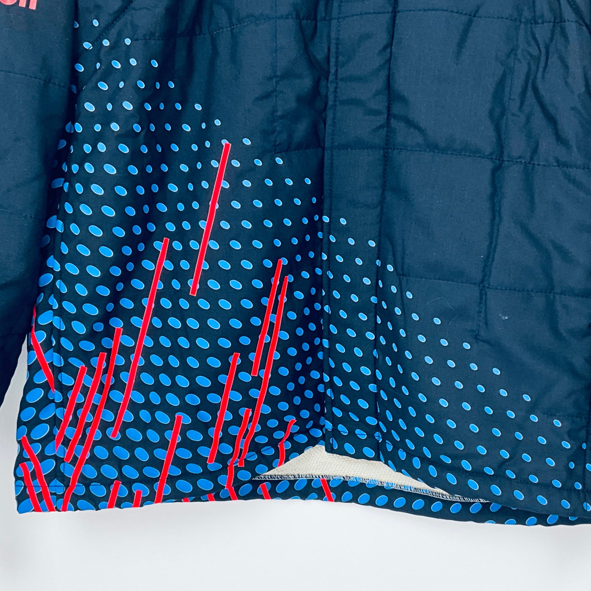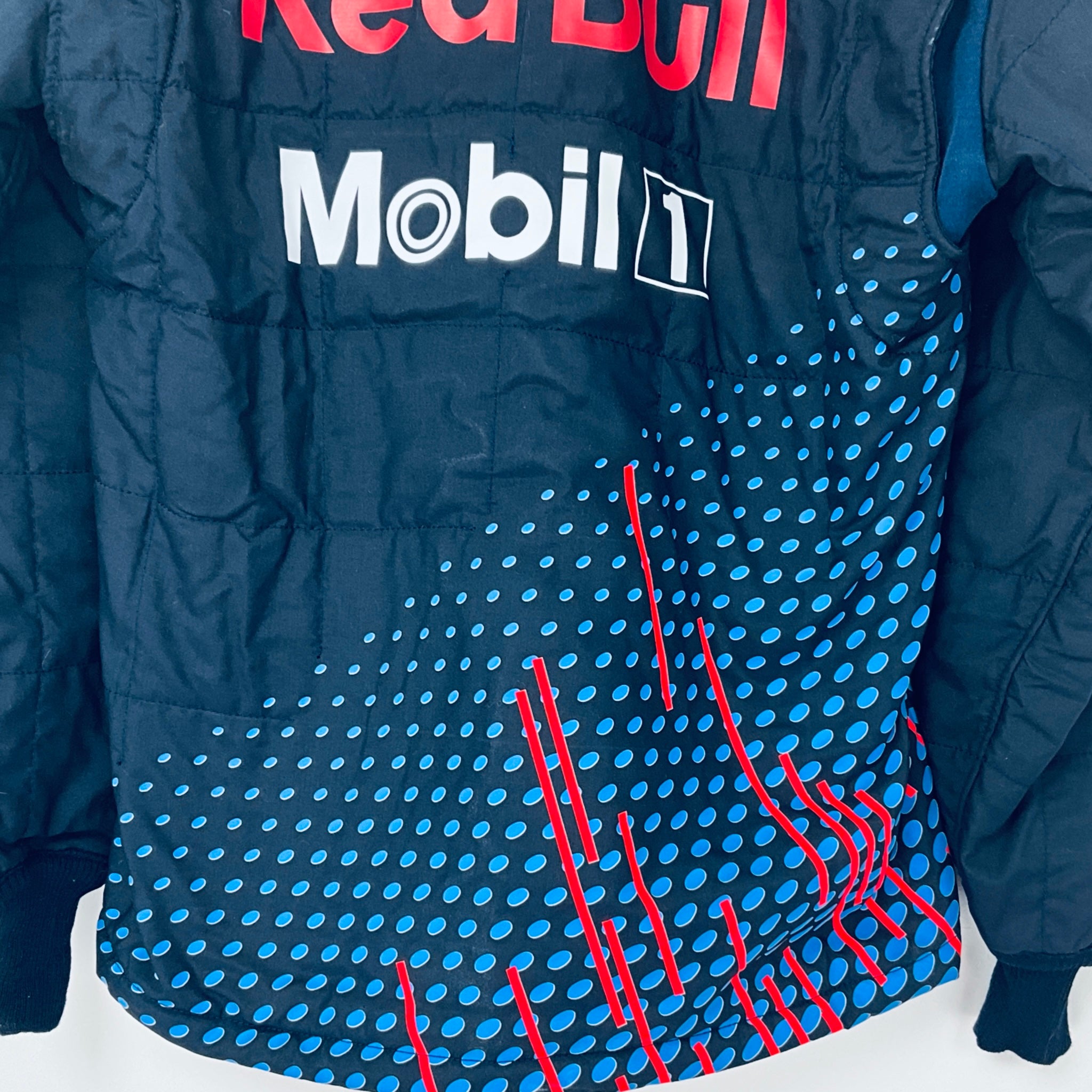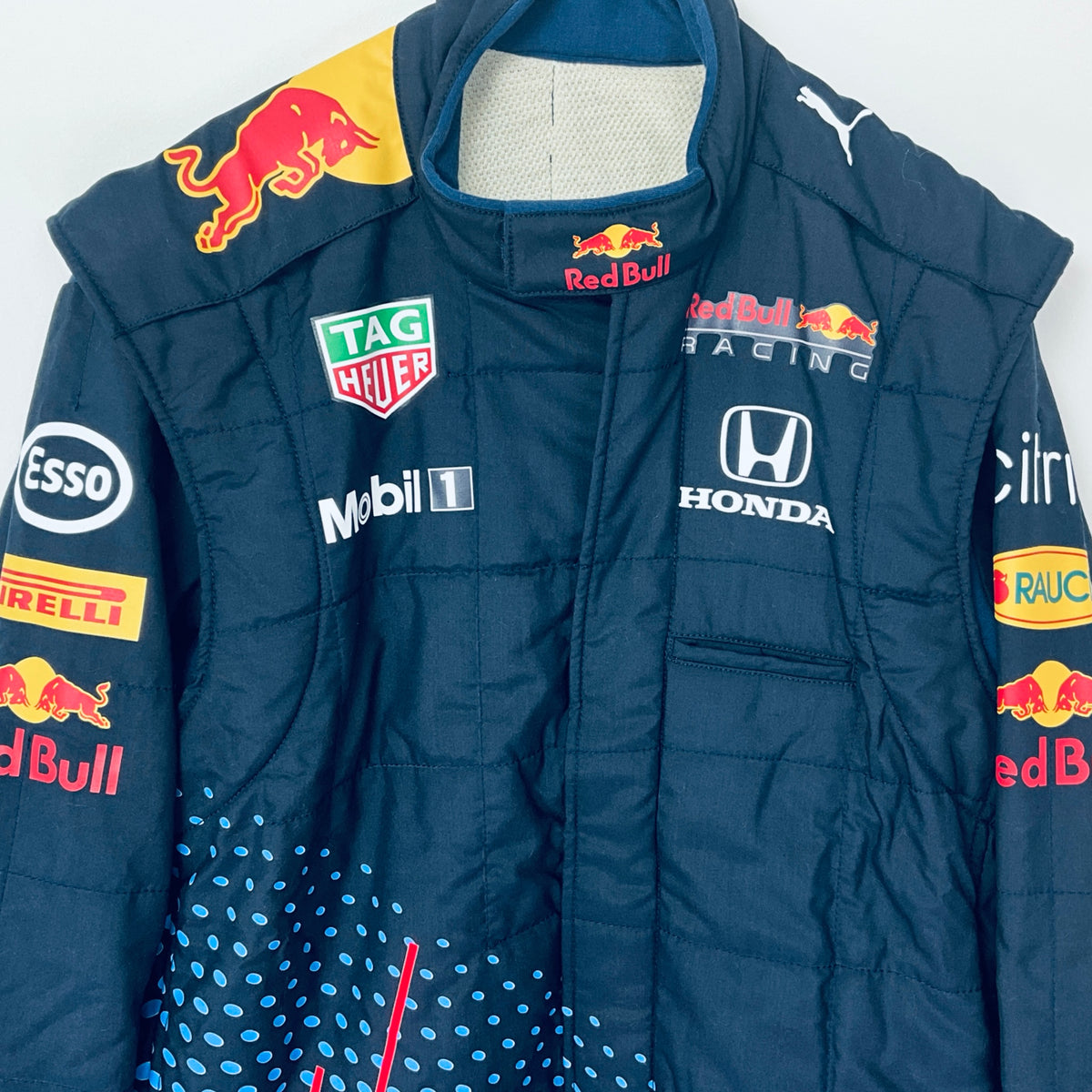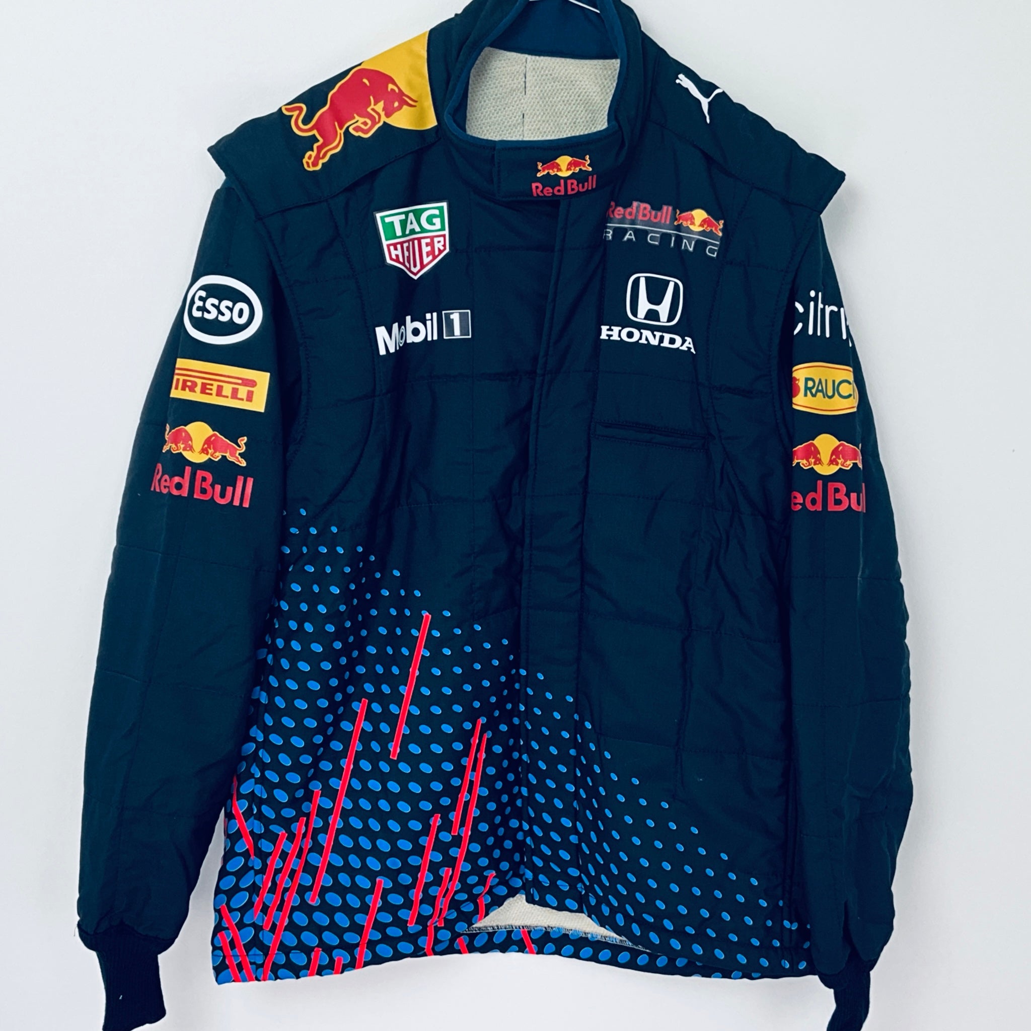 This genuine 2021 team-issued two-piece suit was crafted by Puma exclusively for the Red Bull Racing F1 Team’s front Jack operators crew, responsible for servicing Max Verstappen and Sergio Perez’s cars. Featuring a striking polka dot and stripe pattern in Red Bull red and pale blue on navy, it proudly displays official team logos and sponsor branding from the 2021 season. A rare and highly sought-after piece, this suit is perfect for any dedicated Red Bull Racing fan or F1 memorabilia collector.