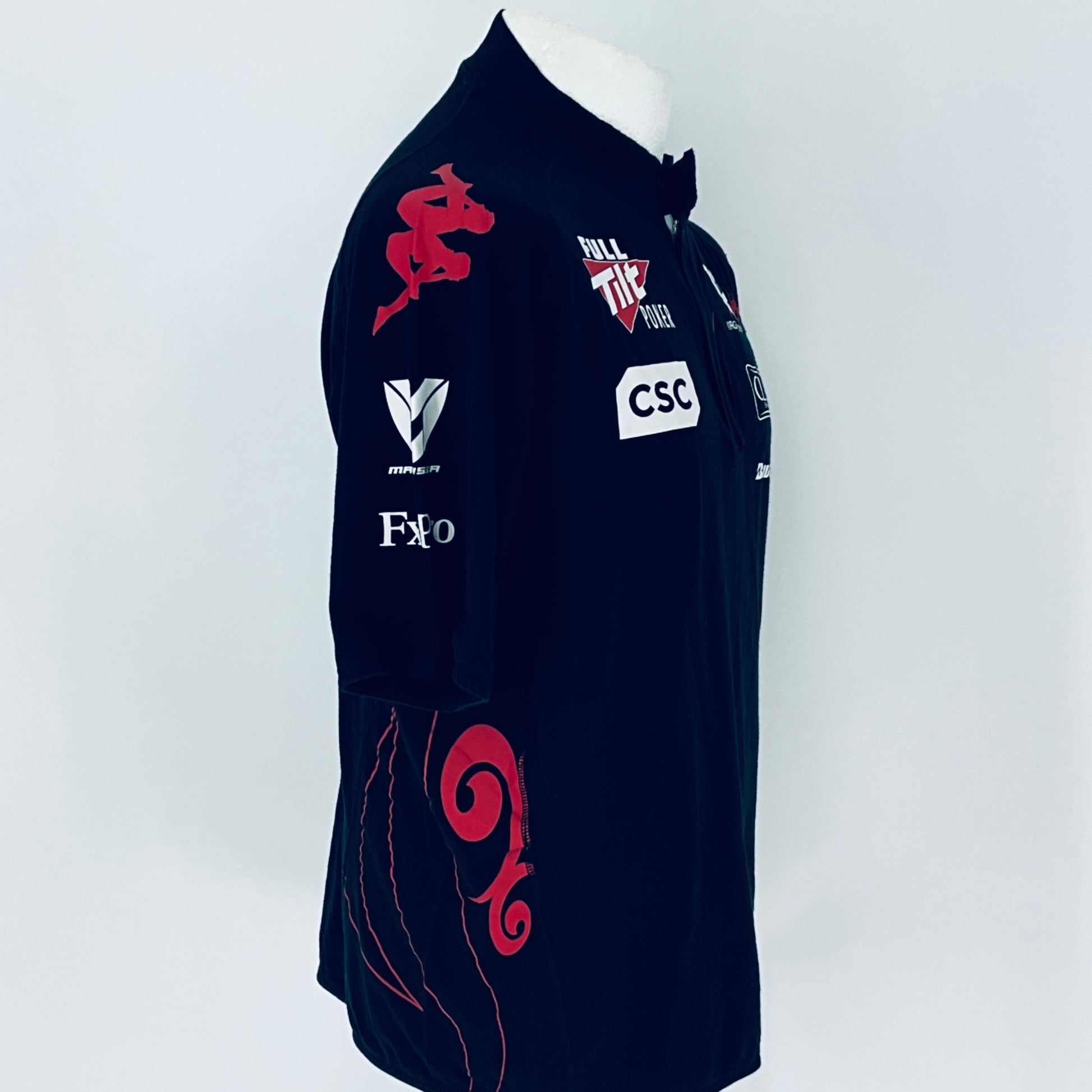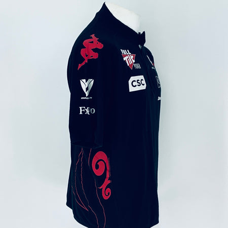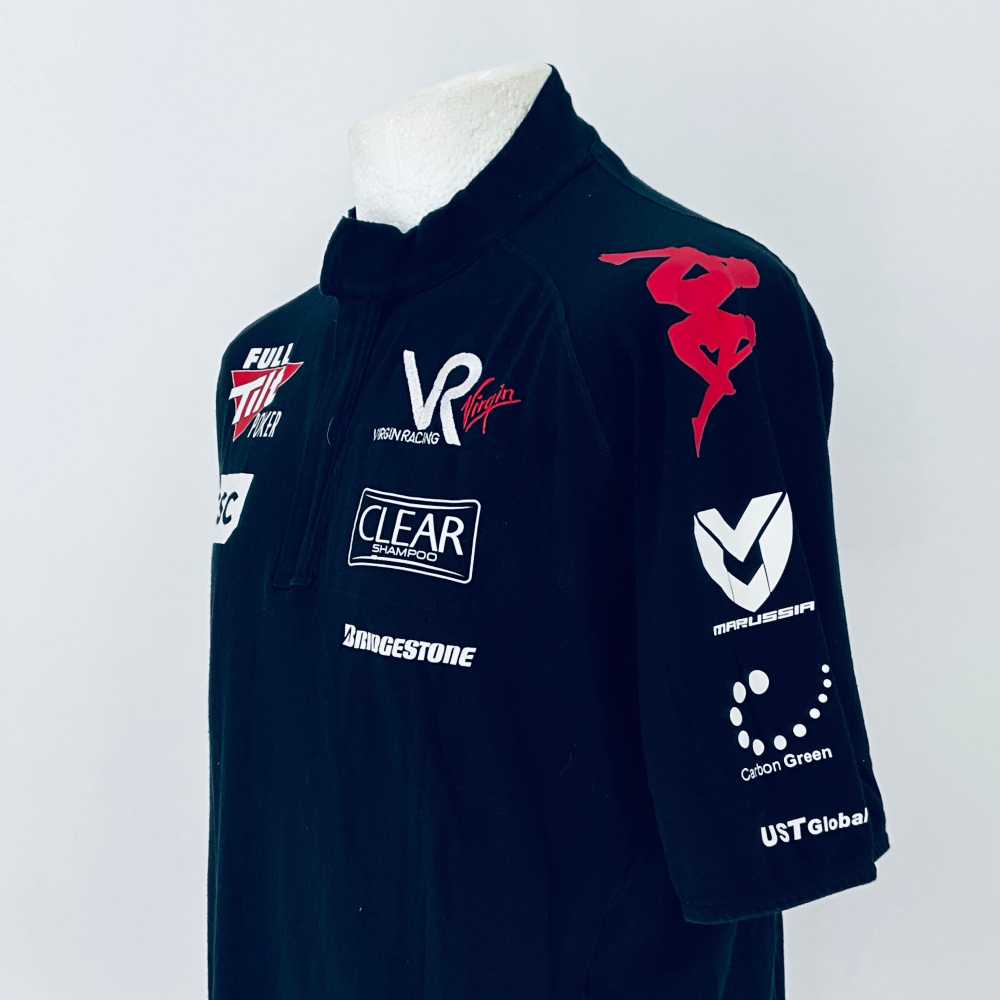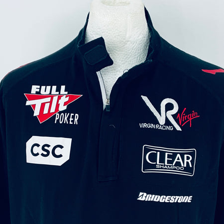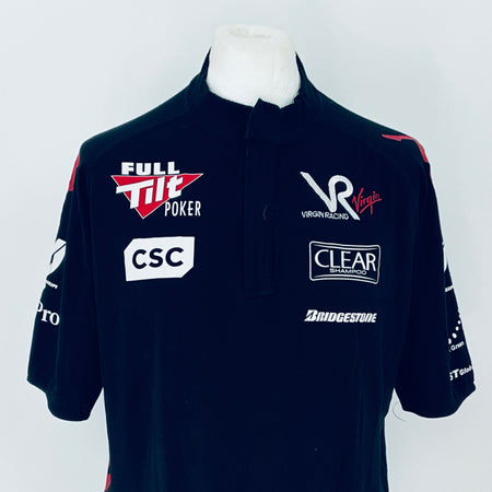 This genuine and Authentic t-shirt was worn by Timo Glock during the 2010 Formula 1 season with the Virgin Racing team, crafted specifically for their drivers own specification by Kappa. The Virgin Racing team competed independently only in 2010 before merging with Marussia the following year. This driver-used garment was designed and worn by Timo Glock ,featuring 210 team and sponsors logos embroidered over the cap. An exceptionally rare and highly sought-after piece, it’s an essential addition for any serious F1 collector.