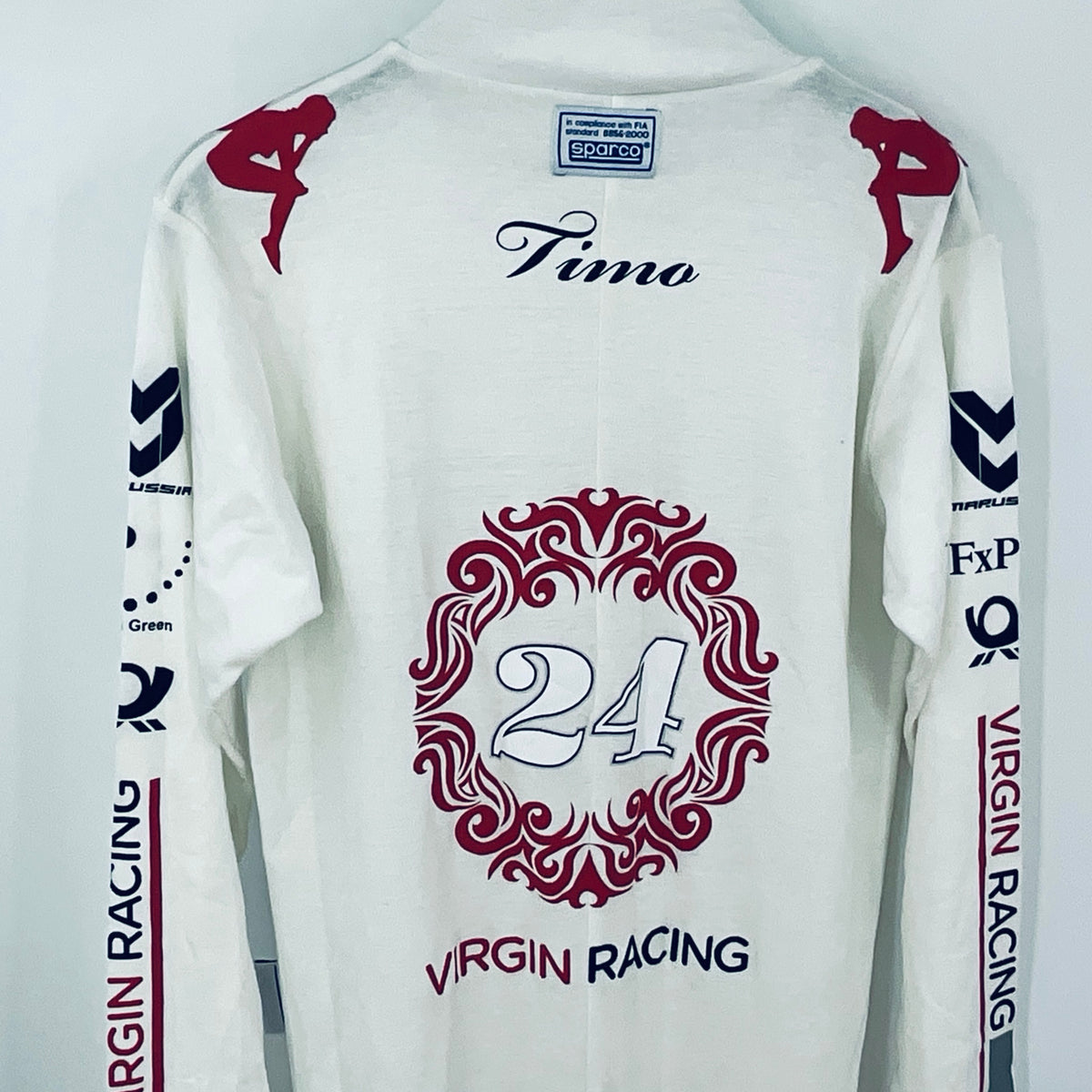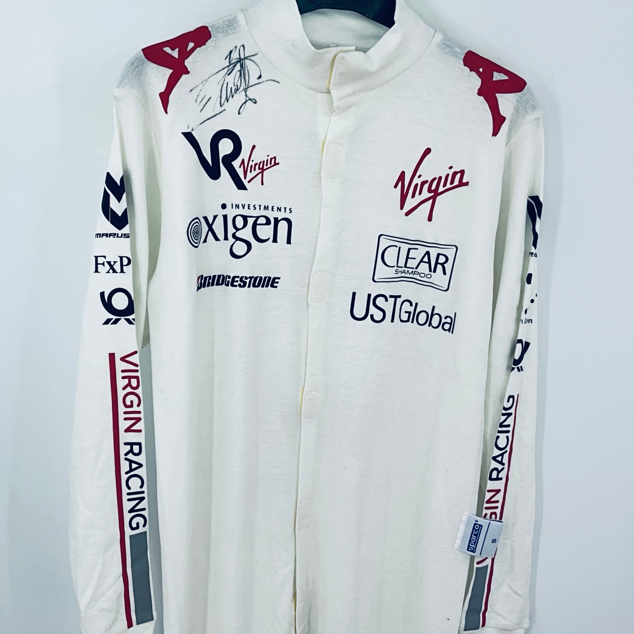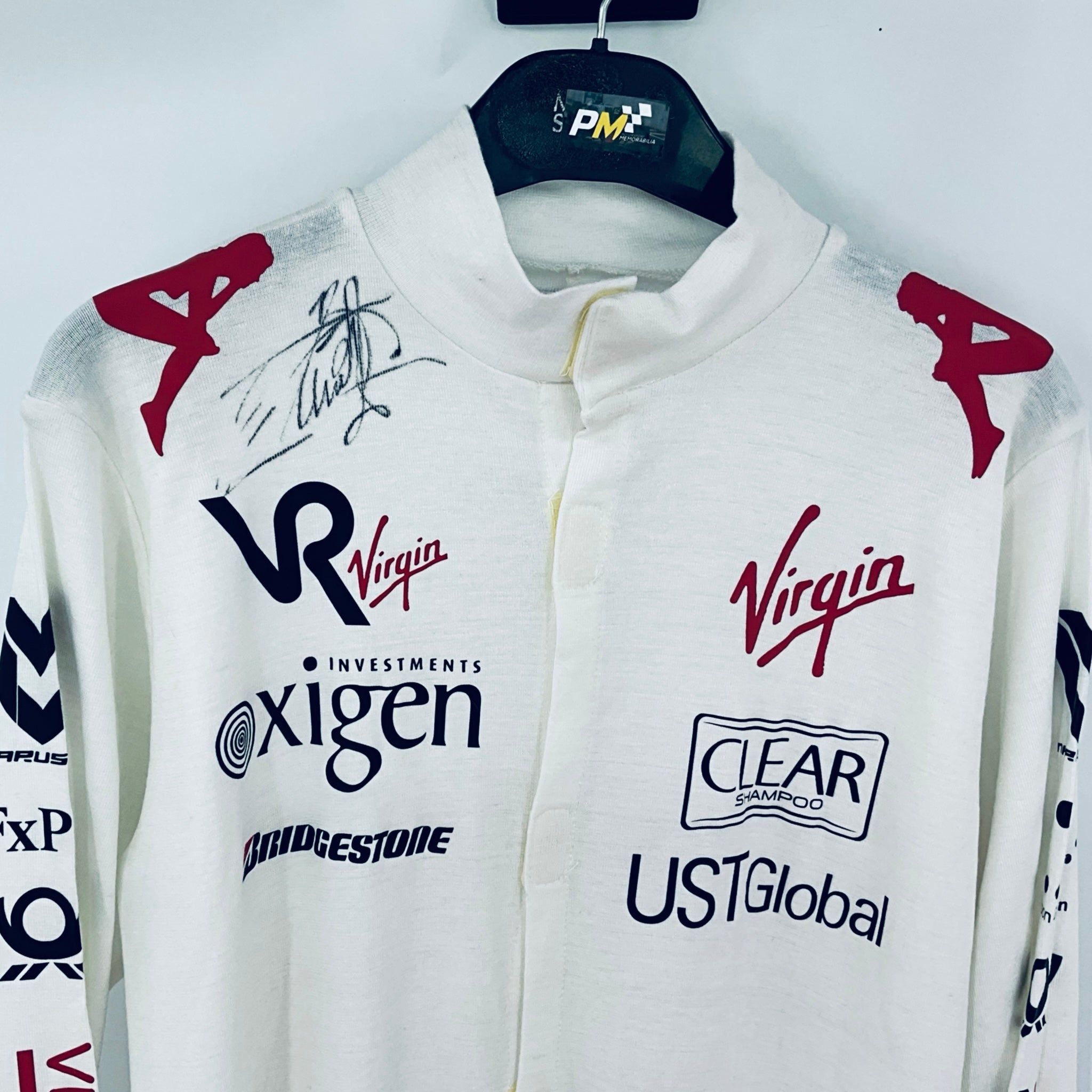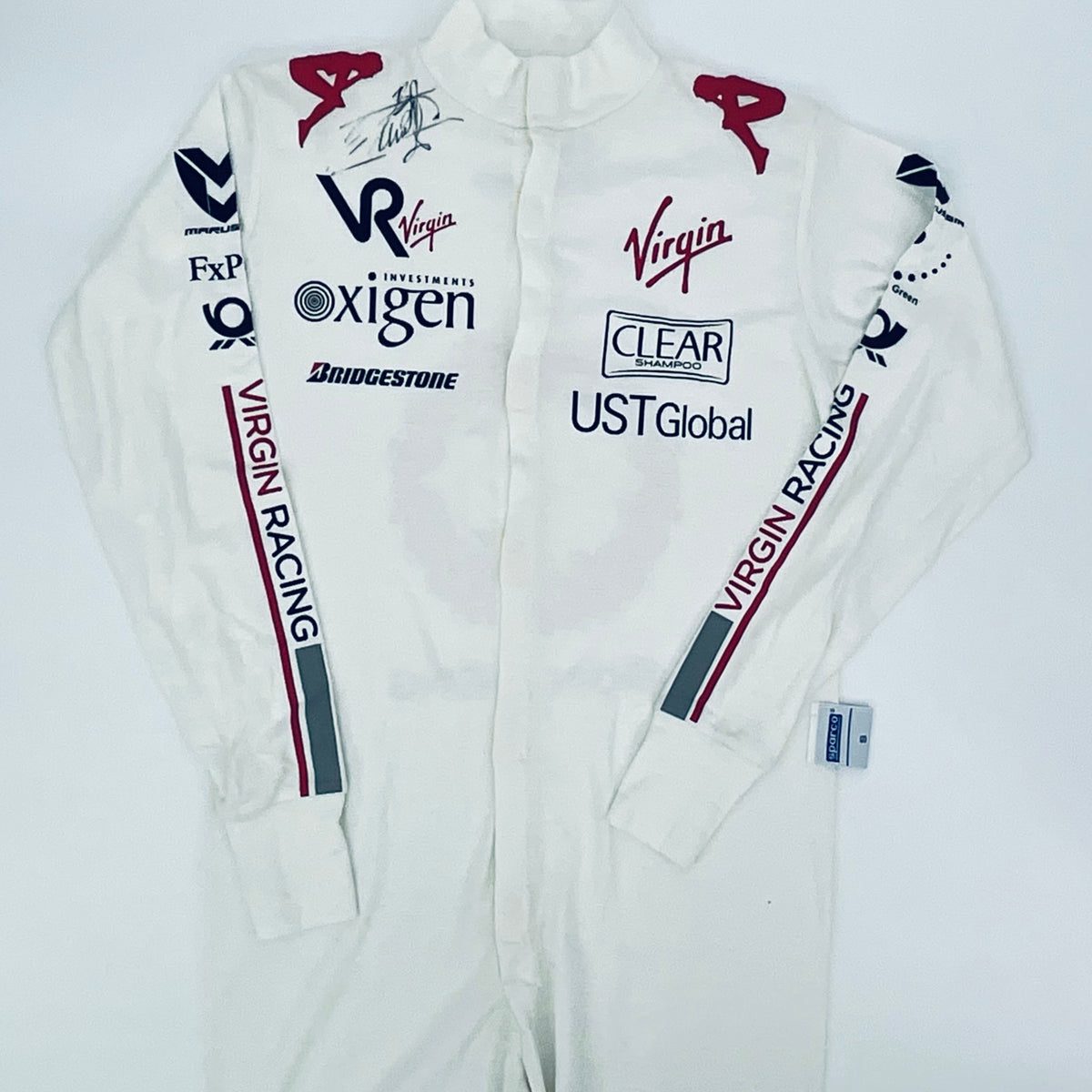 This full-length Nomex undersuit was worn by Timo Glock during the 2010 Formula 1 season with Virgin Racing. Hand-signed by Glock, it’s a rare, race-used item that makes a unique addition to any F1 collection.