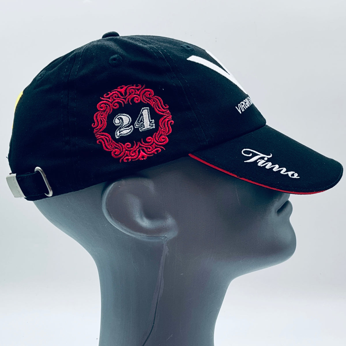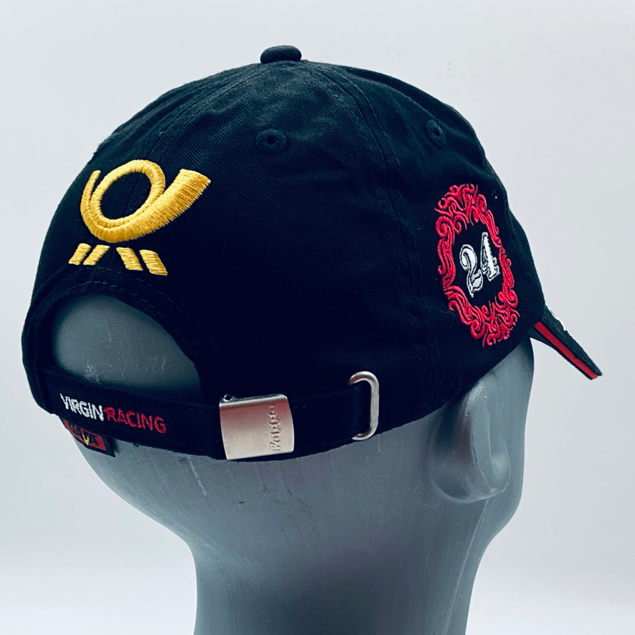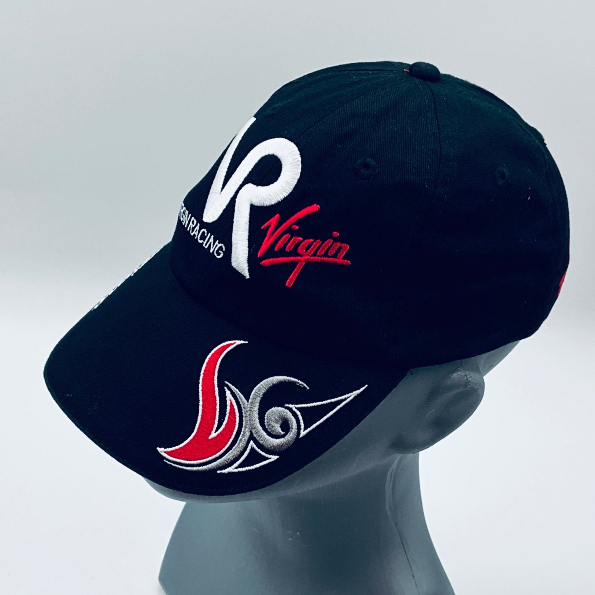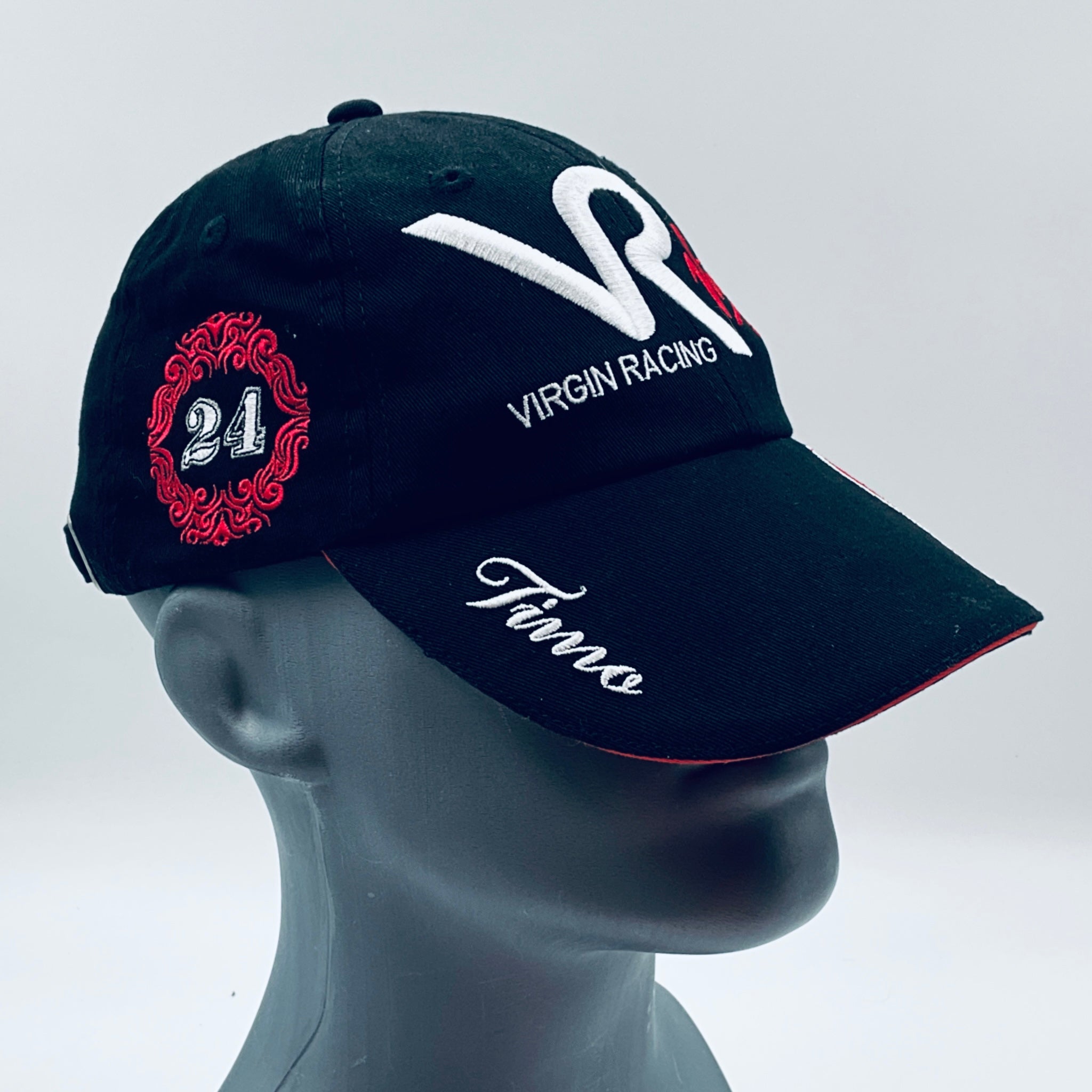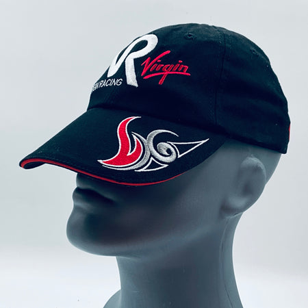 This genuine and Authentic baseball cap was worn by Timo Glock during the 2010 Formula 1 season with the Virgin Racing team, crafted specifically for their drivers own specification by Kappa. The Virgin Racing team competed independently only in 2010 before merging with Marussia the following year. This driver-used garment was designed and worn by Timo Glock ,featuring his race number, name and team logos embroidered over the cap. An exceptionally rare and highly sought-after piece, it’s an essential addition for any serious F1 collector.