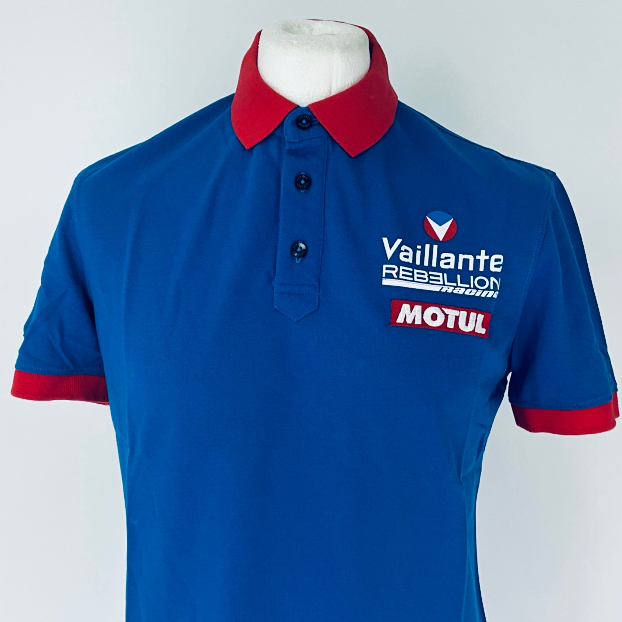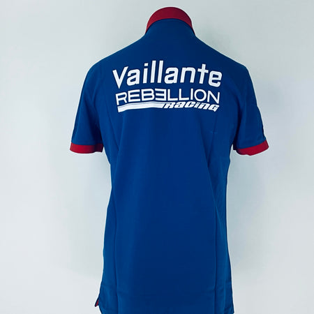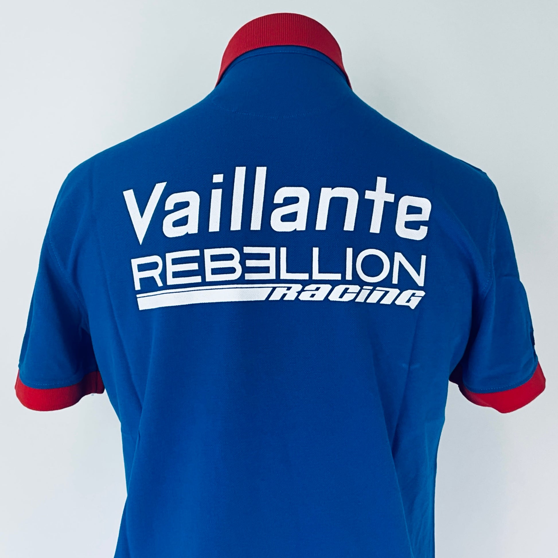 Authentic Vaillante Rebellion Racing Team LMP1 polo shirt, originally issued to the Rebellion Racing crew for the 2017 Le Mans 24 Hours. Made from 100% cotton, this brand new iconic shirt showcases the vibrant Vaillante blue,, complemented by the team’s logo on both chest and back. Not sold to the public, this rare collectible is an essential addition for passionate Rebellion supporters and Le Mans fans eager to own a genuine piece of motorsport heritage.